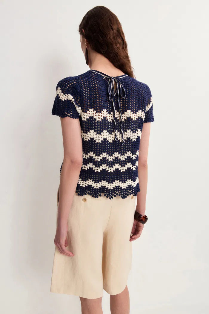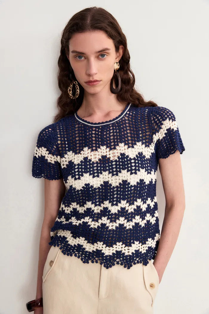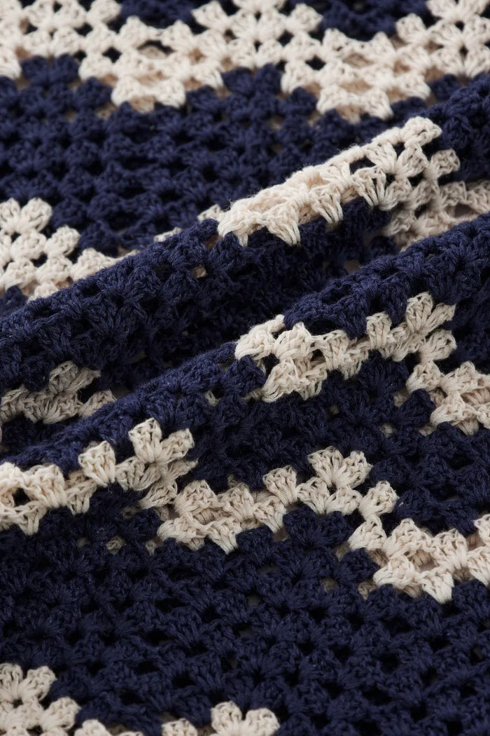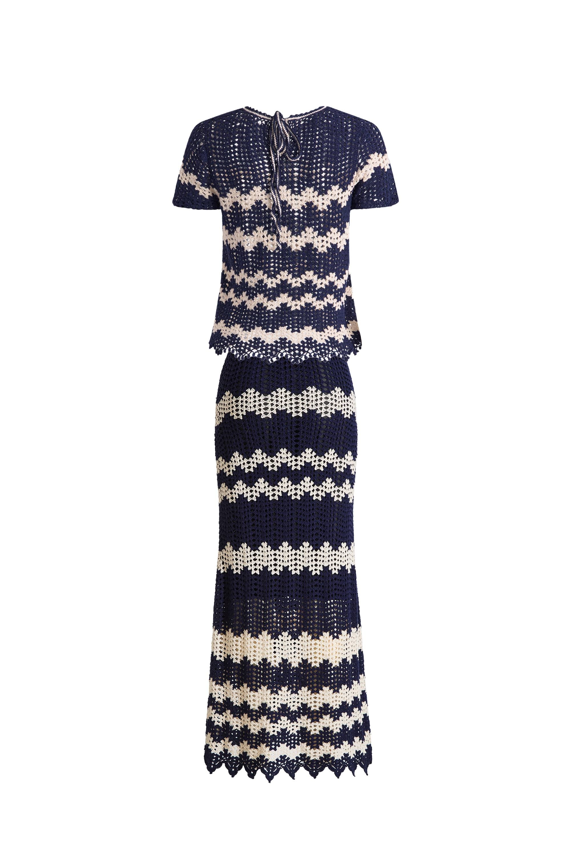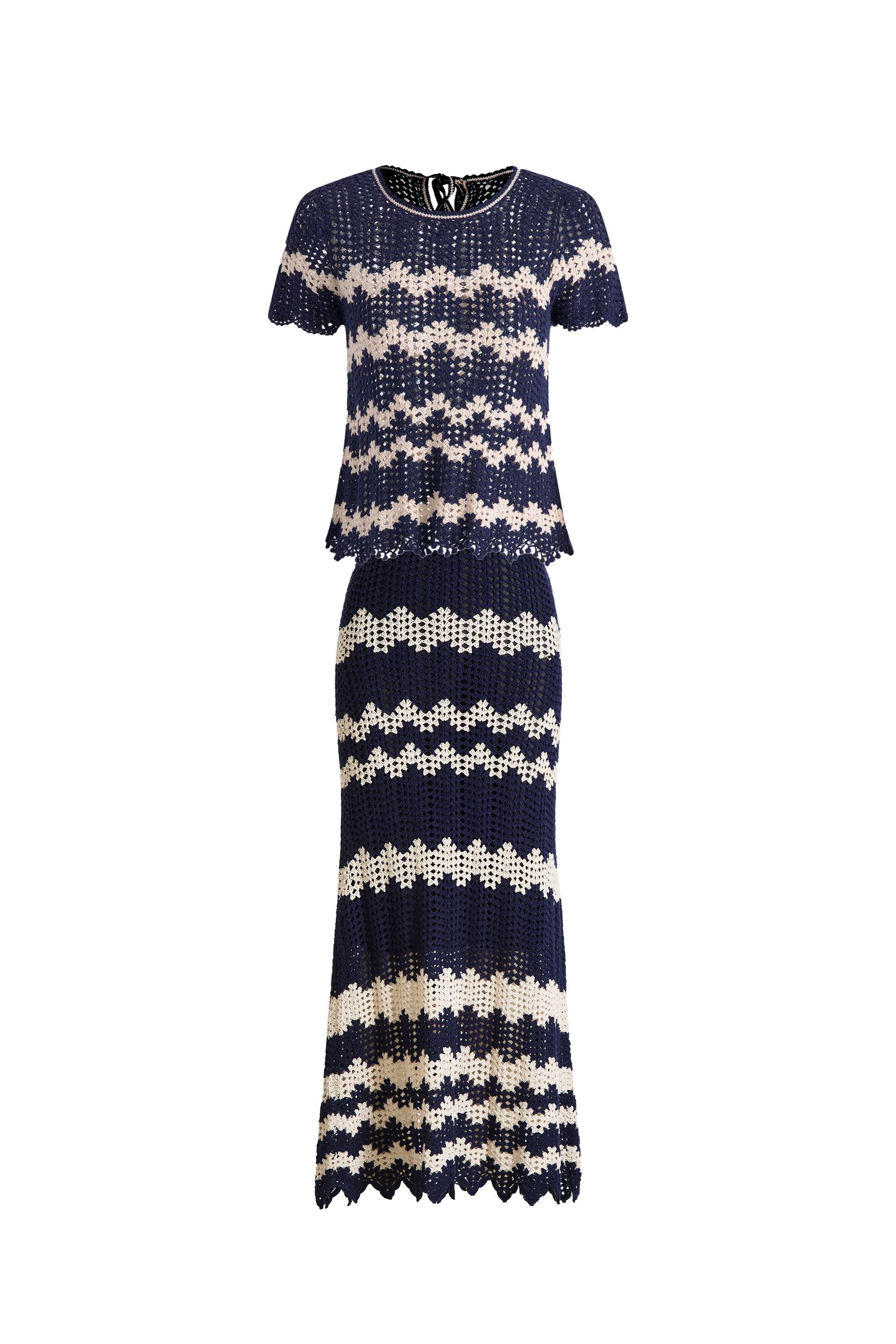 Cecilia Contrast Handcrafted Crochet Top and Skirt Matching Set in Cotton-Linen Blend Knit