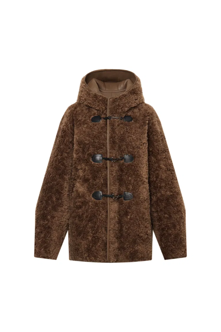Clémence Shearling Hooded Coat in Vegan Leather and Wool Blend