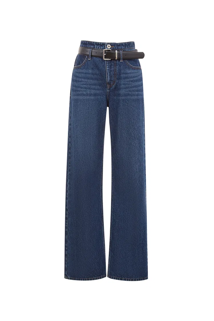Crisp Removable Belt Straight Jeans in Washed Cotton Denim