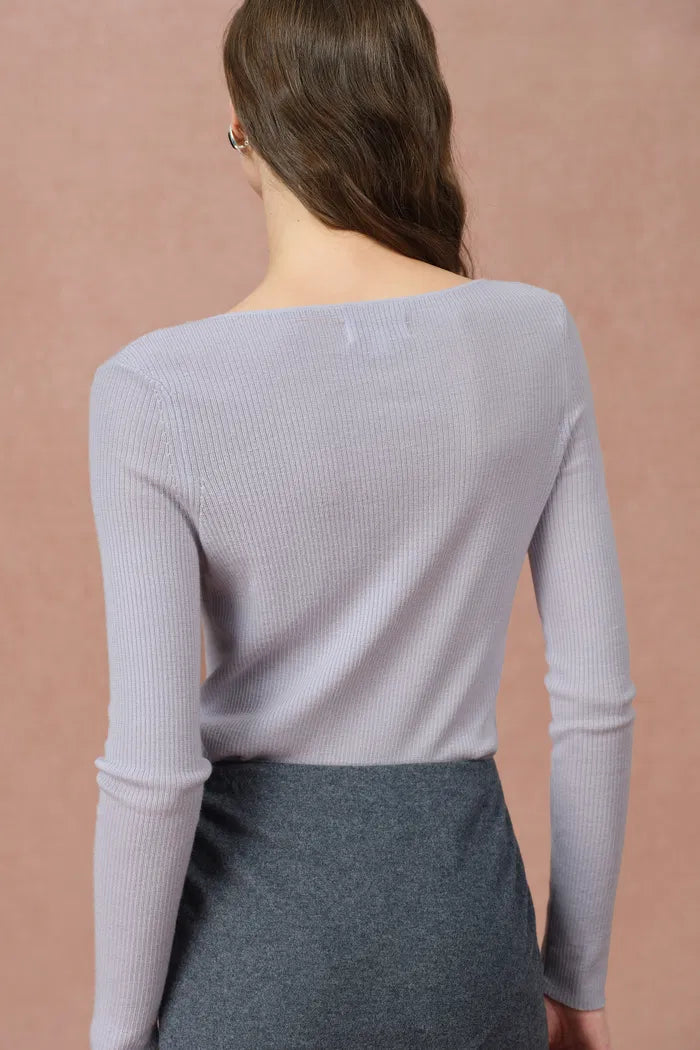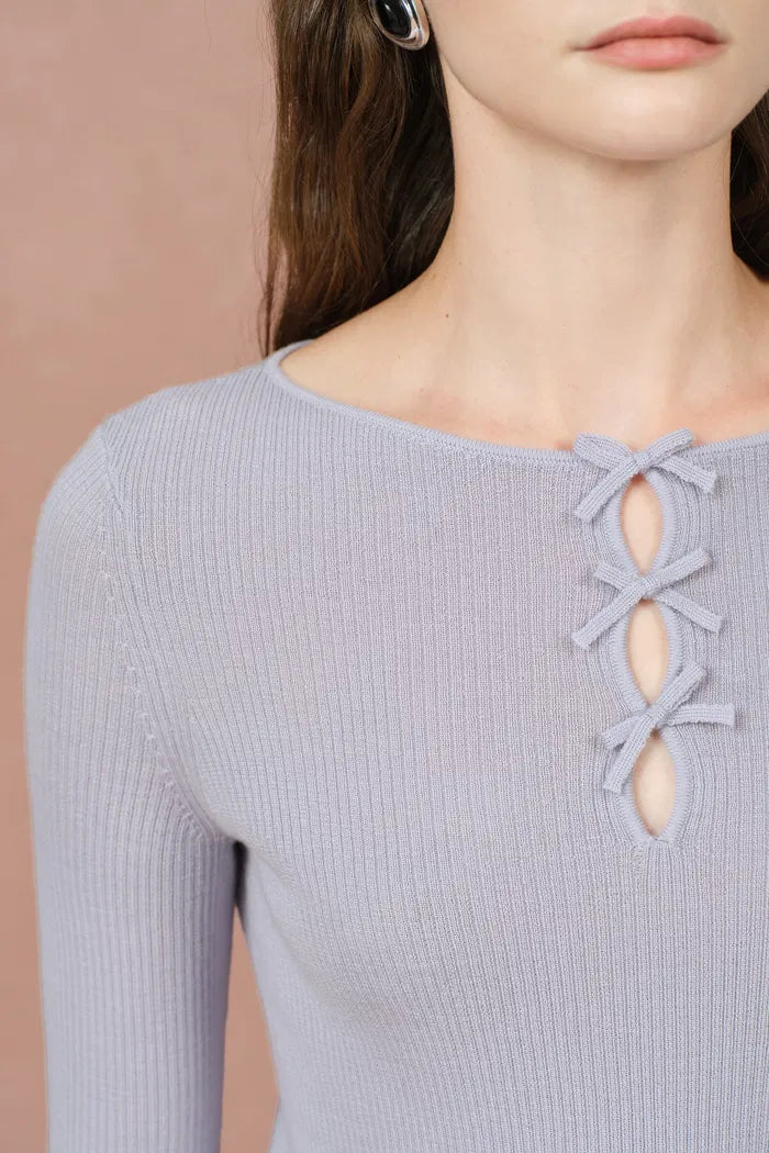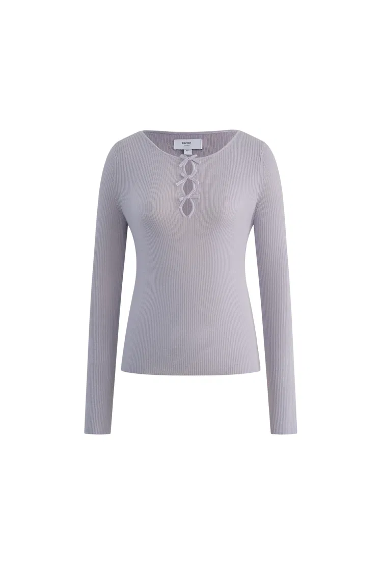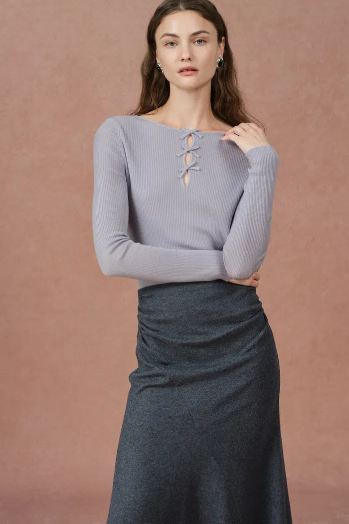 Eden Purple Bow Tie Fitted Top in Merino Wool with Stretch Knit
