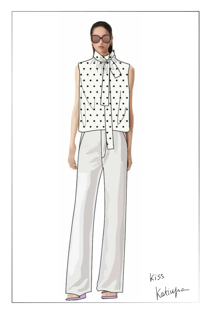Katiuscia designs for women who love to express their unique personality through details. Black leads the way, softened by hints of vanilla white, warm cappuccino brown, and ice blue. Gold accents highlight the tailoring and add richness. For her, clothing becomes a way to express personal freedom and stand out naturally.
