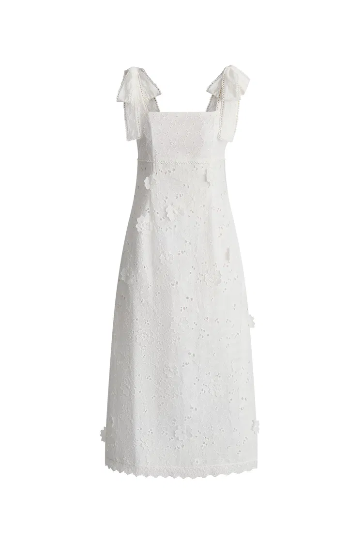 Elise Handcrafted Flora Applique Midi Dress in Embroidered Cotton