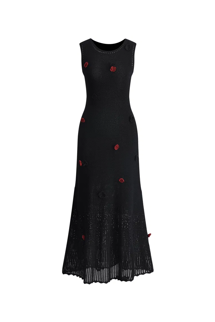 Ellie Black Sleeveless Floral Crochet Dress in Cotton Linen Knit
