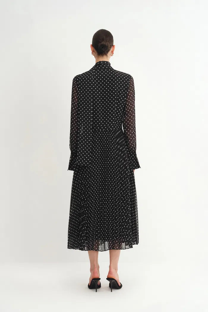 This Ellie long sleeve dress transforms classic polka dots through varying sizes and transparent layering. Extra-long ties capture evening breezes, while lantern sleeves add romantic volume. The irregular hemline and pleated details create movement with every step.