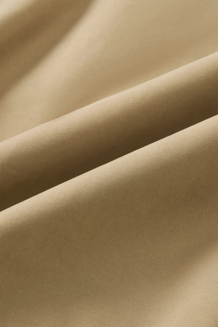 Soft trench fabric with peach-skin texture that's smooth and fluid. Drapes well for natural movement with bloom-style tailoring. Neutral grey-beige works easily for both office and everyday wear.