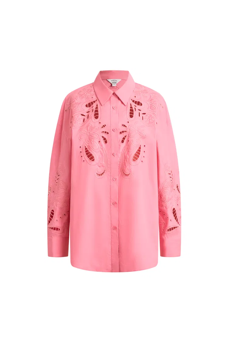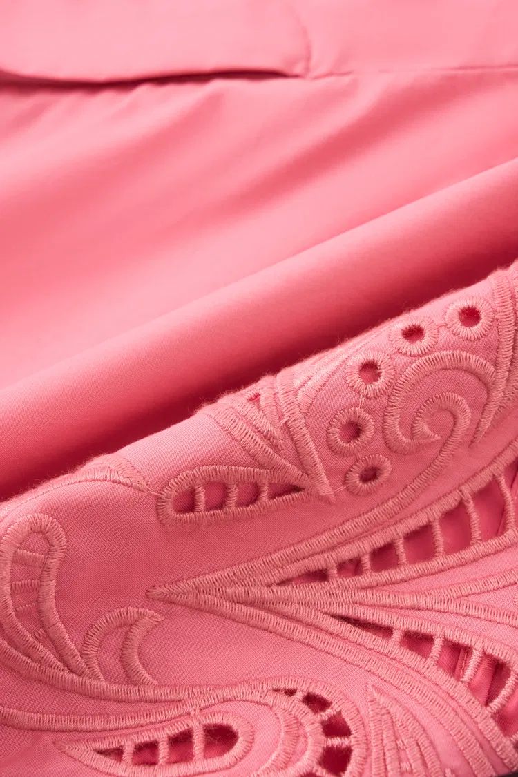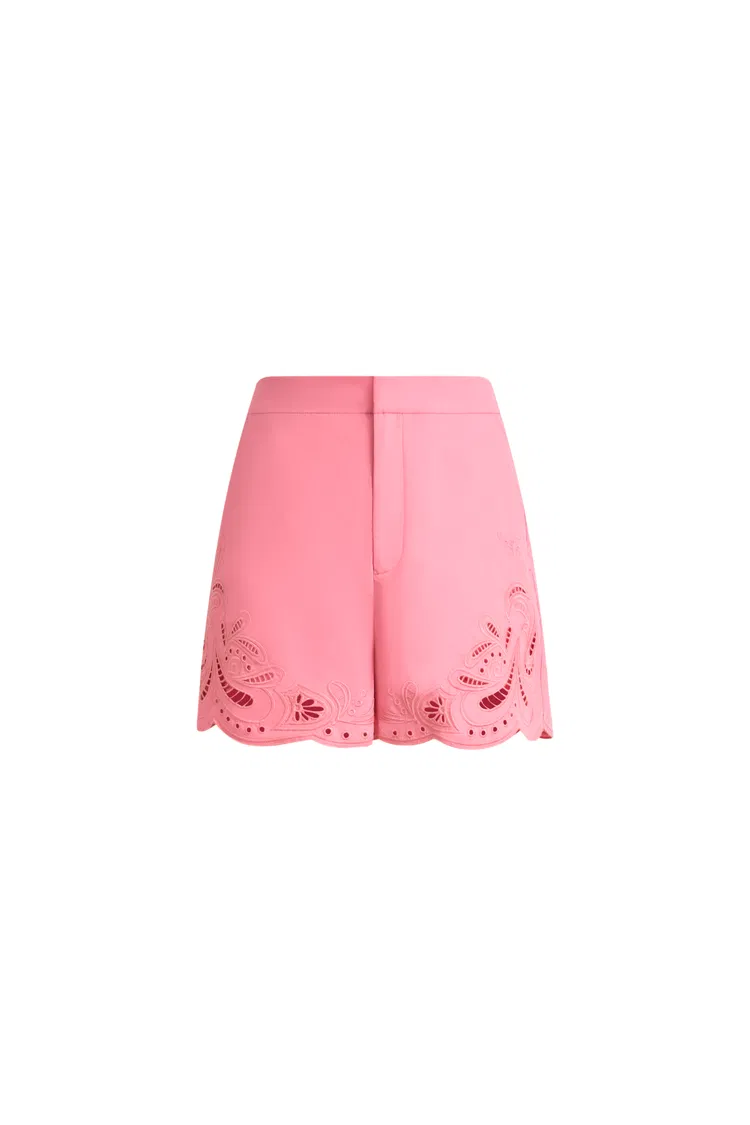These high-density poplin shorts feature delicate paisley eyelet embroidery for a breathable, botanical feel. The clean A-line cut and hidden pockets make them a smart choice that transitions easily from beach to city.