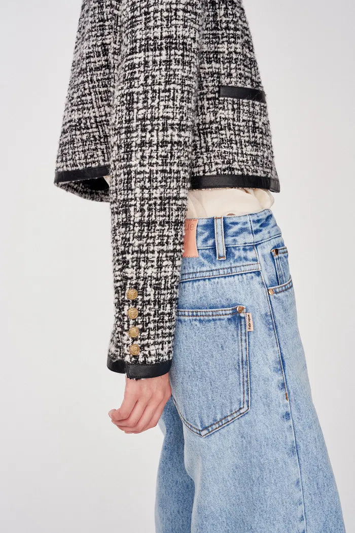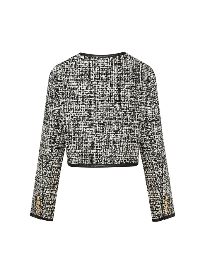 Think of this jacket as the ultimate power piece that rewrites the rules of classic tailoring. Crafted with a shortened, boxed silhouette that breaks away from traditional lengths, it's anything but ordinary. Standout gold buttons adorned with vintage-inspired badges add a layer of luxury.