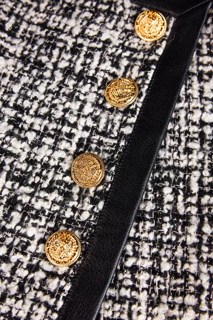 Classic black and white bouclé. Mixed thickness wool loops create irregular texture. Gold thread accents. Rich, warm handle with structured drape. Daily wear shows refined taste.