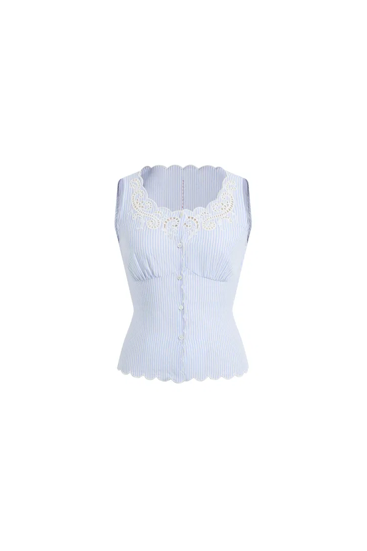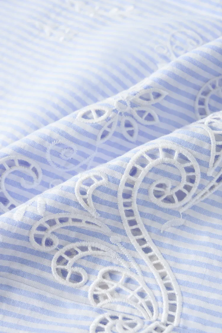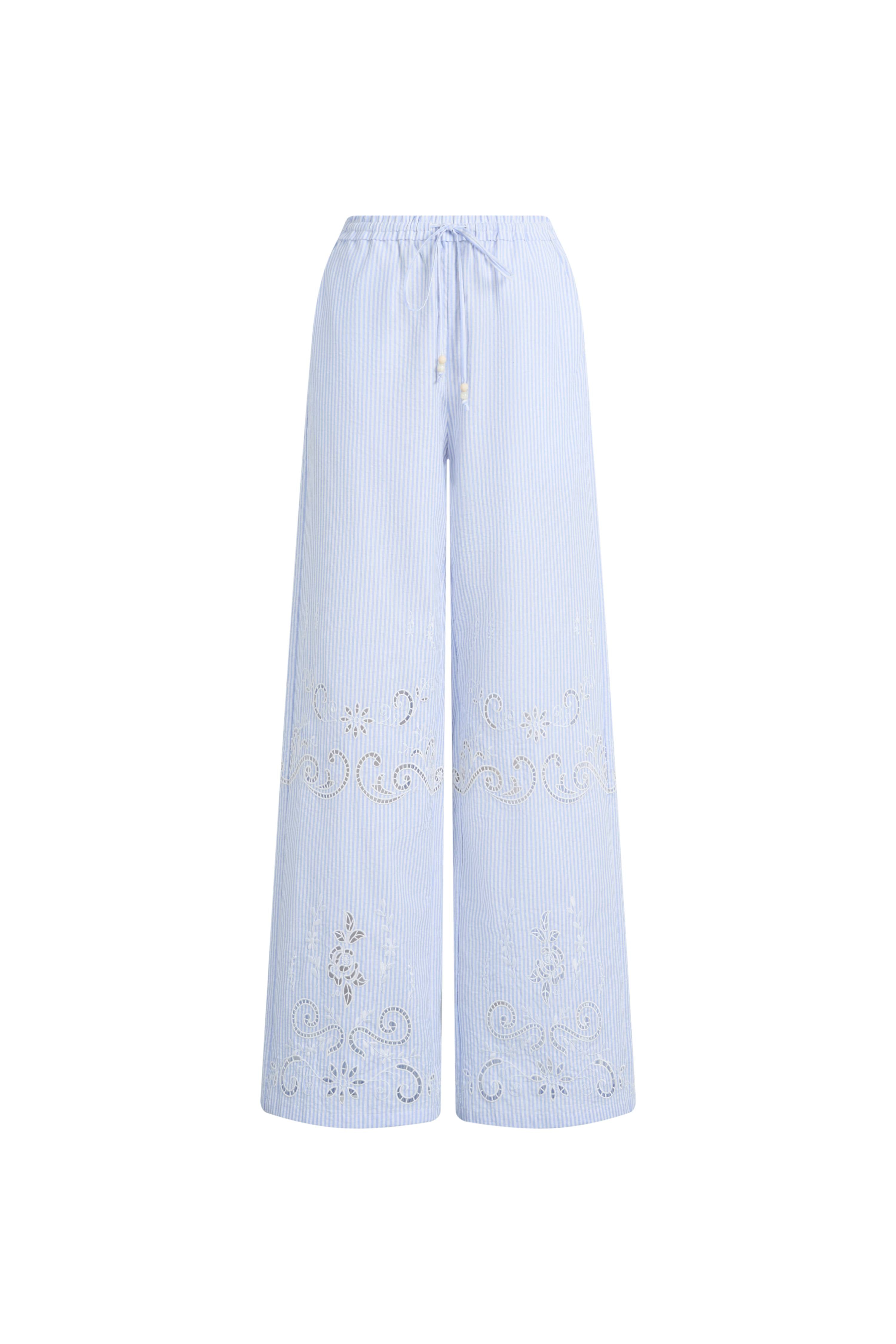 More charming than a standard striped pant, this pair stands out through its scalloped embroidery and light crinkled cotton texture. The loose fit keeps them comfortable and breathable, especially when you want something casual that still feels considered.