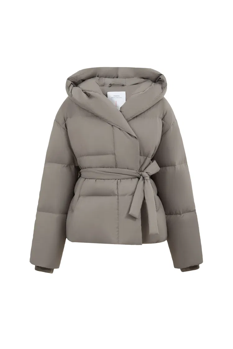 Iliana Gray Belted Hooded White Duck Down Jacket in Ultra Light Fabric