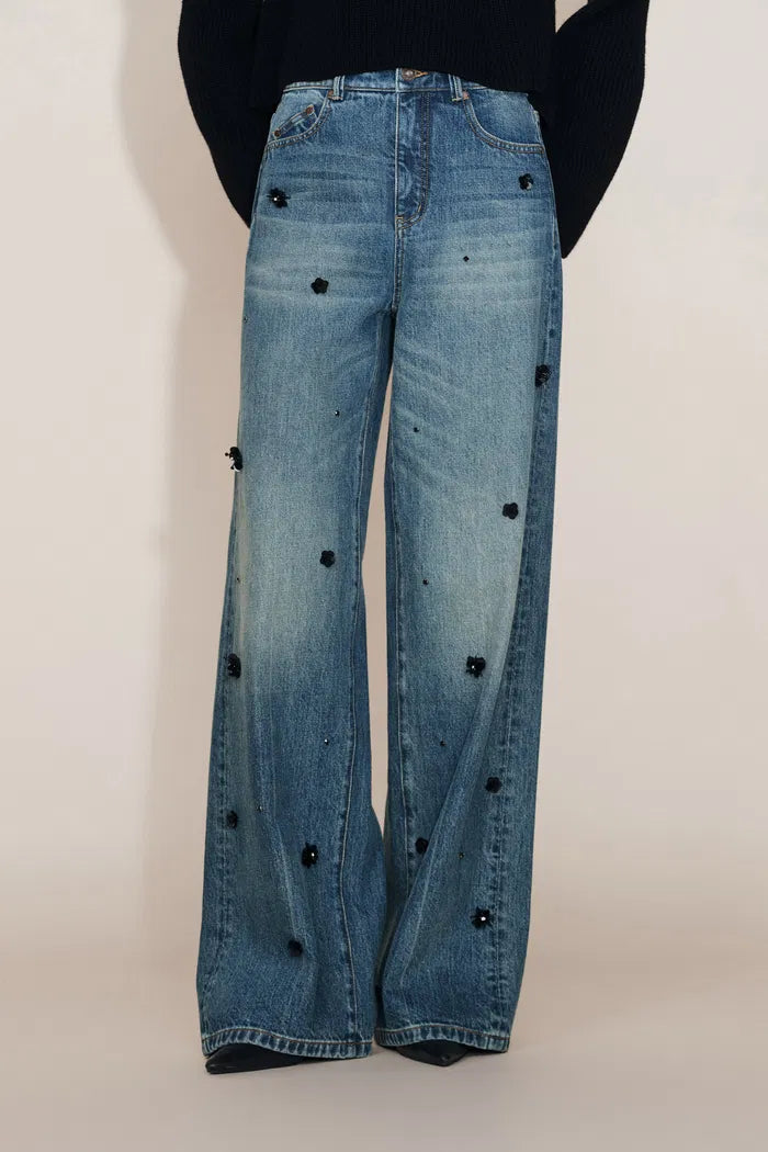 Imogen Hand Beaded Denim Trousers in Cotton Denim