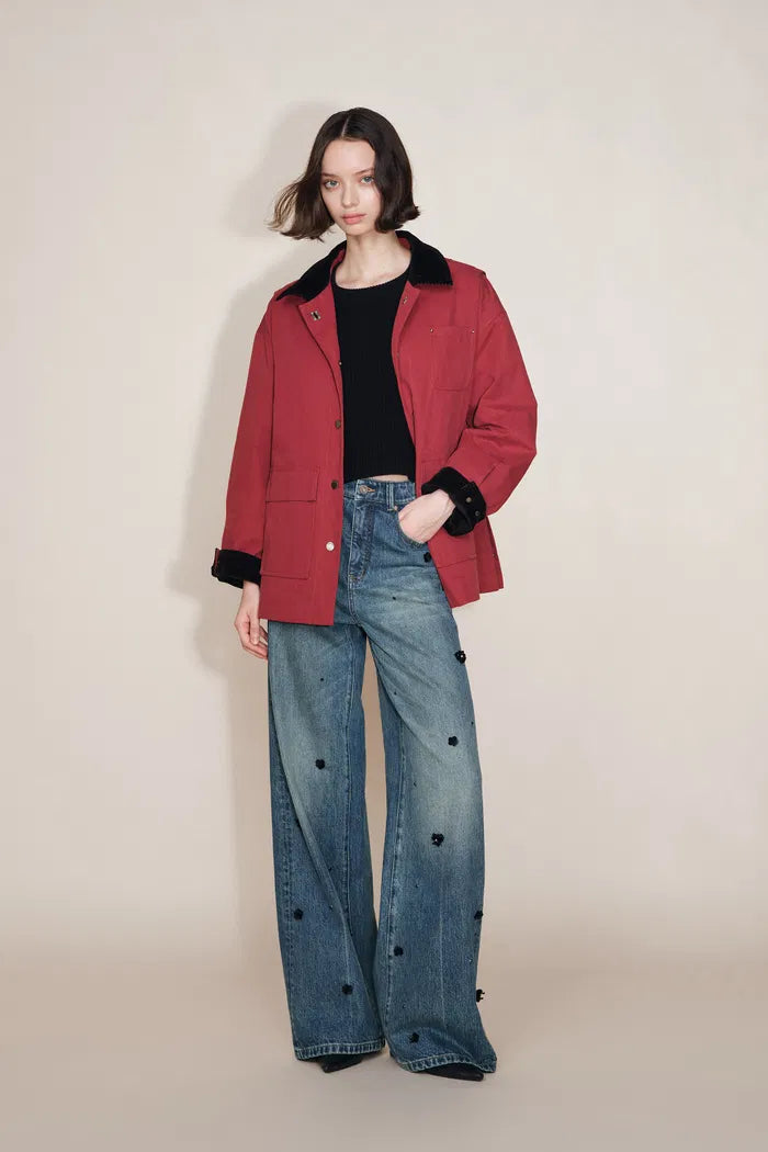 Four-season pure cotton water-washed denim that's soft and breathable. Lightweight washing creates vintage fade effects enhanced by sparkling hand-beaded and rhinestone details.