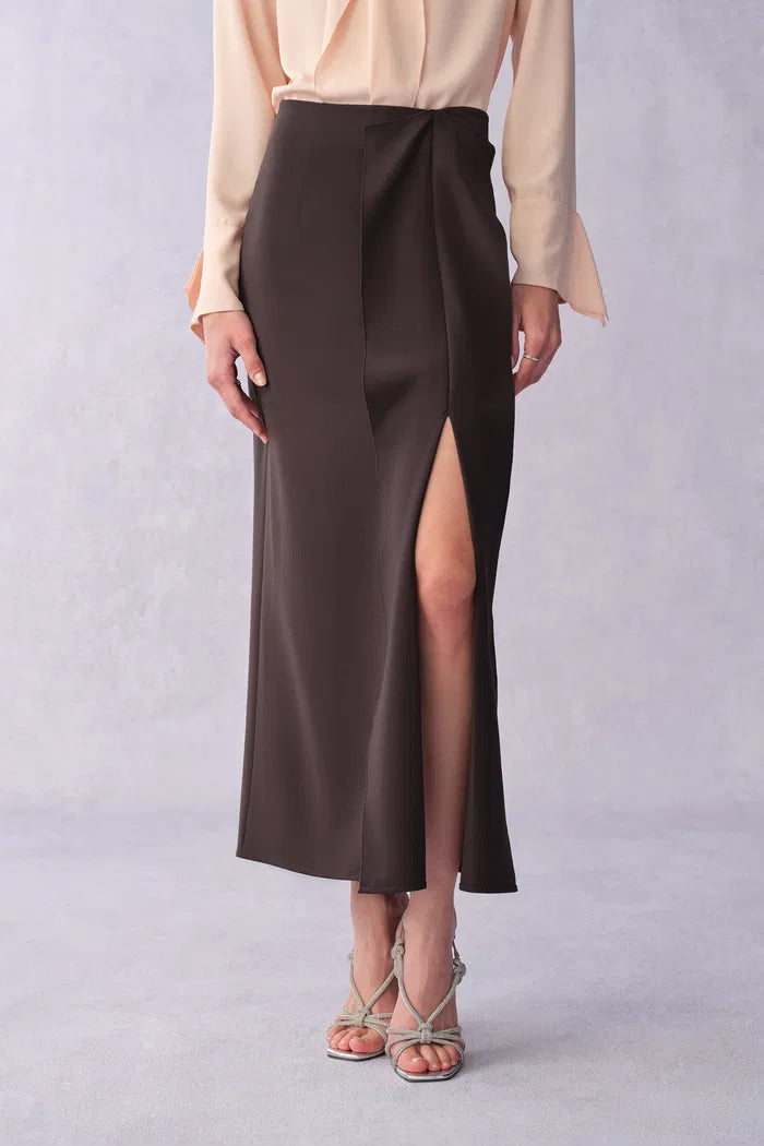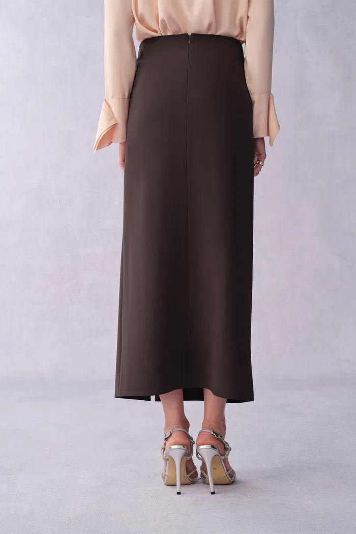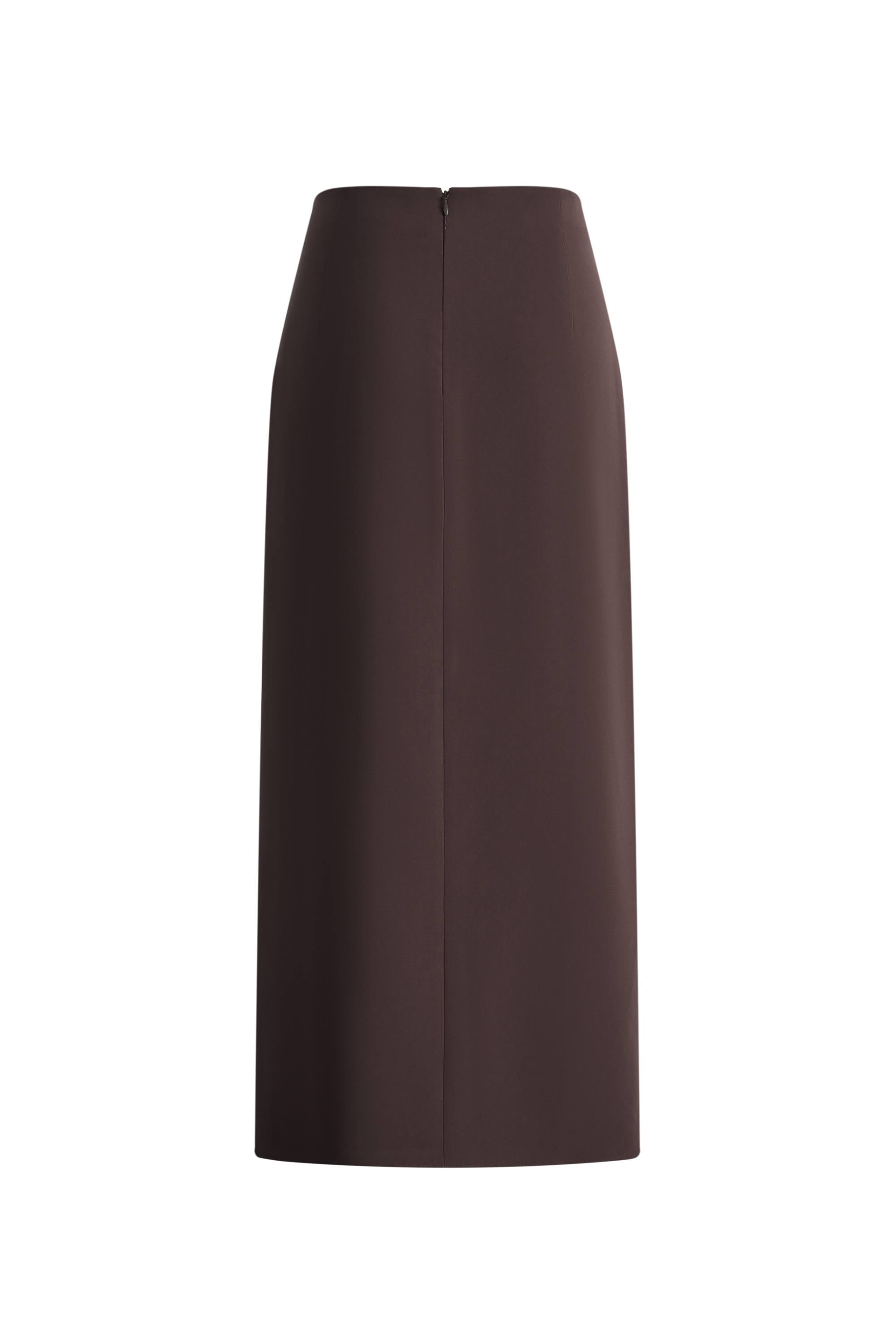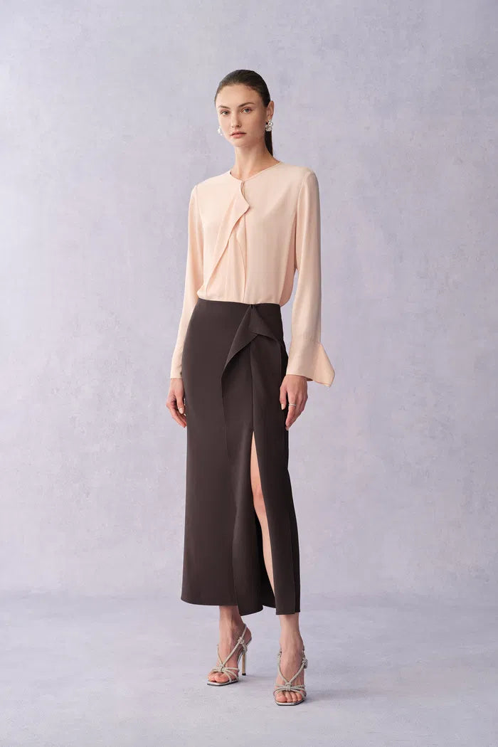 Isao Side Slit Ruffle Maxi Skirt in Stretchy Matte Fabric