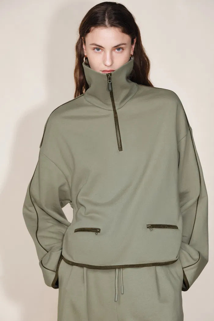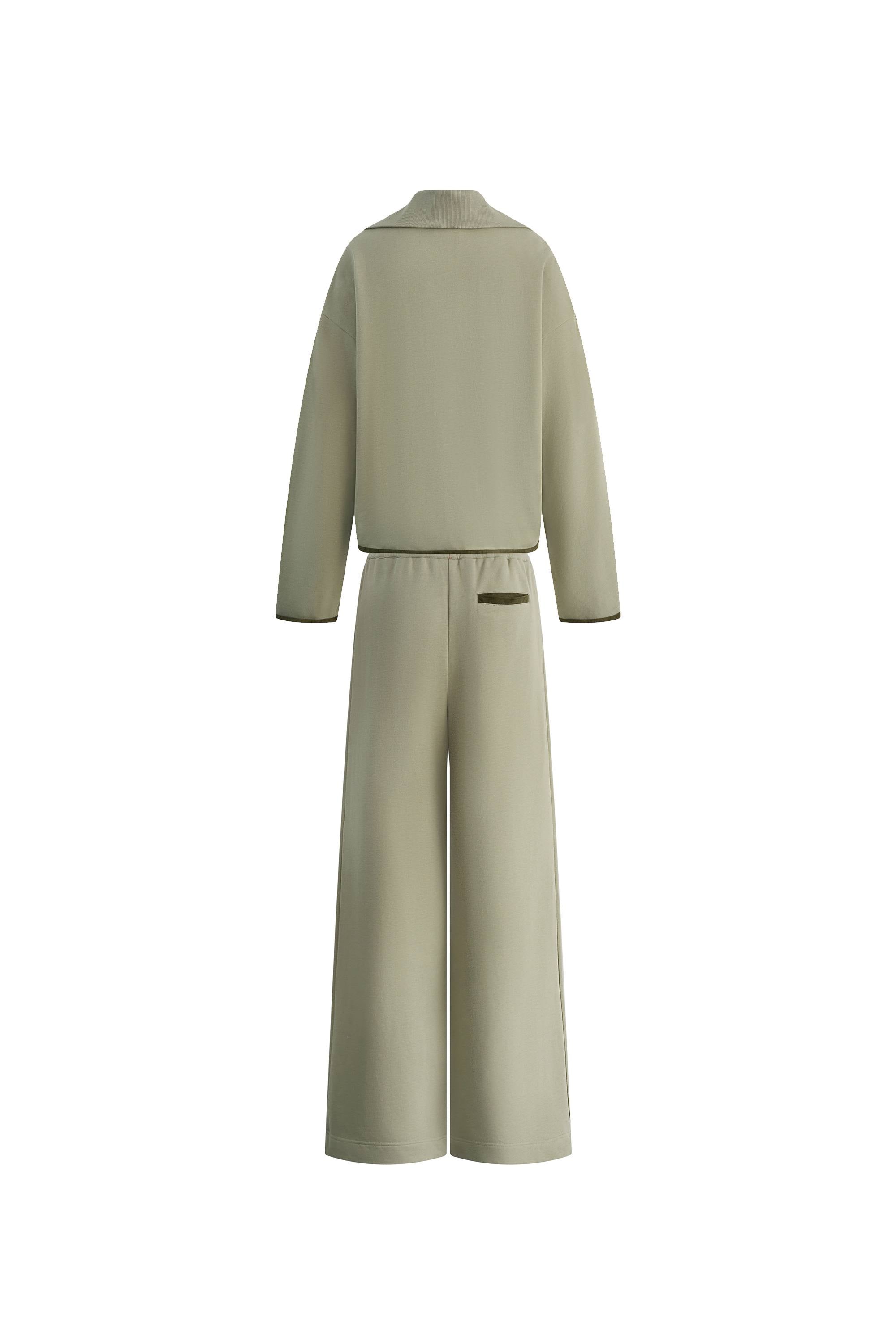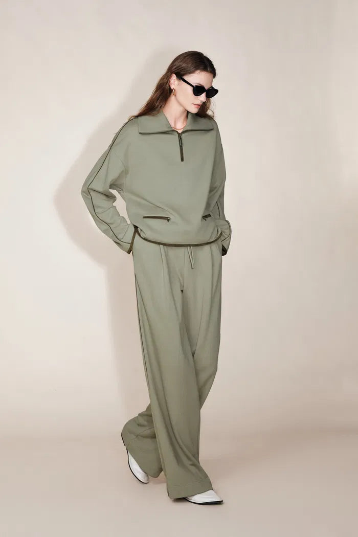 Jane Contrast Trimmed Lapel Zip Up Sweatshirt and Pants Matching Sets in Cotton