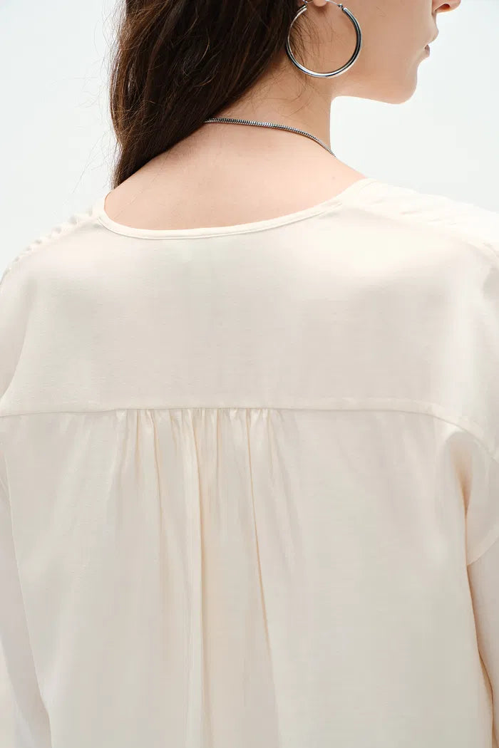 Modal-enhanced silk acetate with matte surface. Cloud-light with velvet touch. Exceptional breathability and moisture control for summer comfort.
