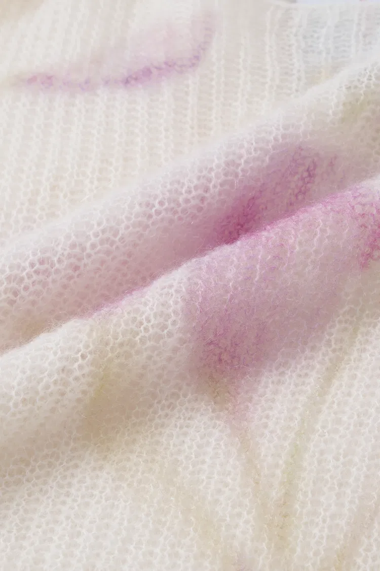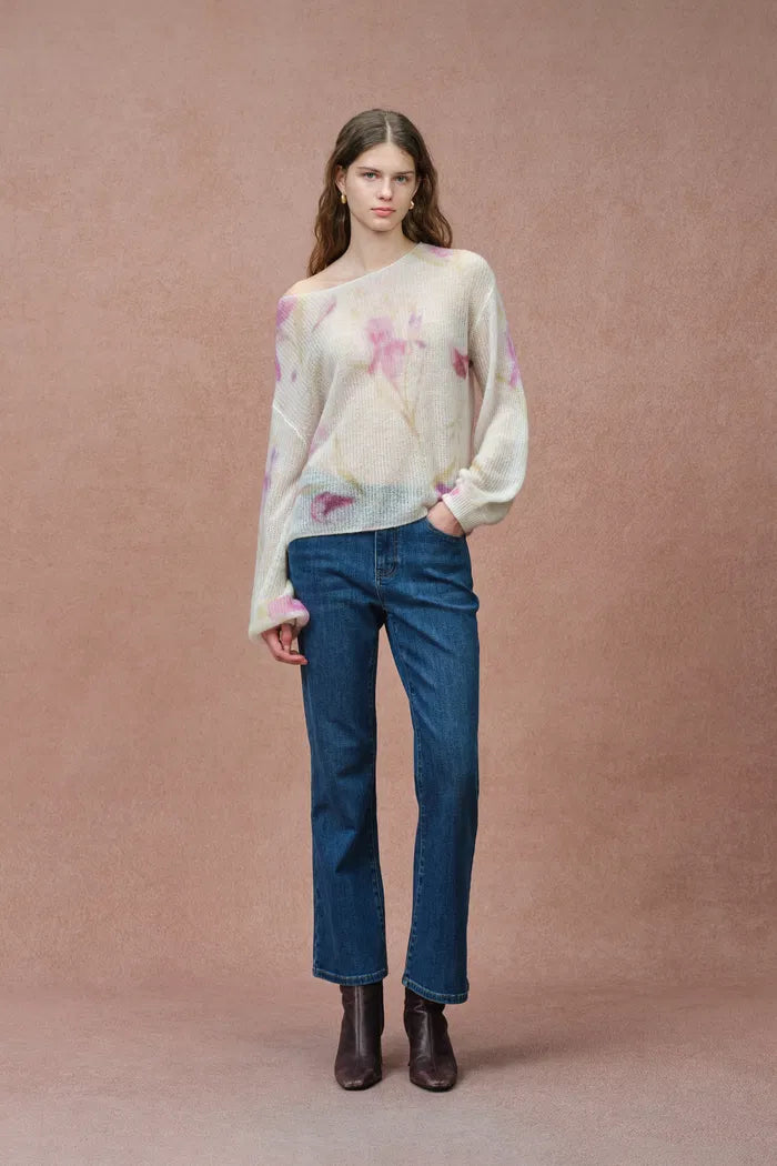 Lilia Hand Painted Iris and Lily Print Knit Sweater in Merino-Mohair Blend