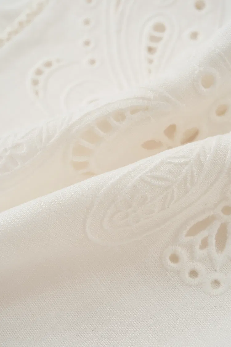 Lilou French Cutwork Embroidery Ruffle-Sleeve Top in Cotton & Linen