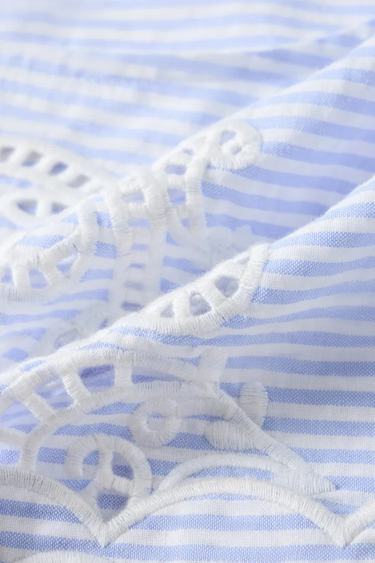 A softer take on the summer camisole, this one combines blue-and-white stripes with broderie-style embroidery and a gently cinched waist. The crinkled cotton gives it light texture, making it an easy piece to wear with denim, skirts, or simple trousers.