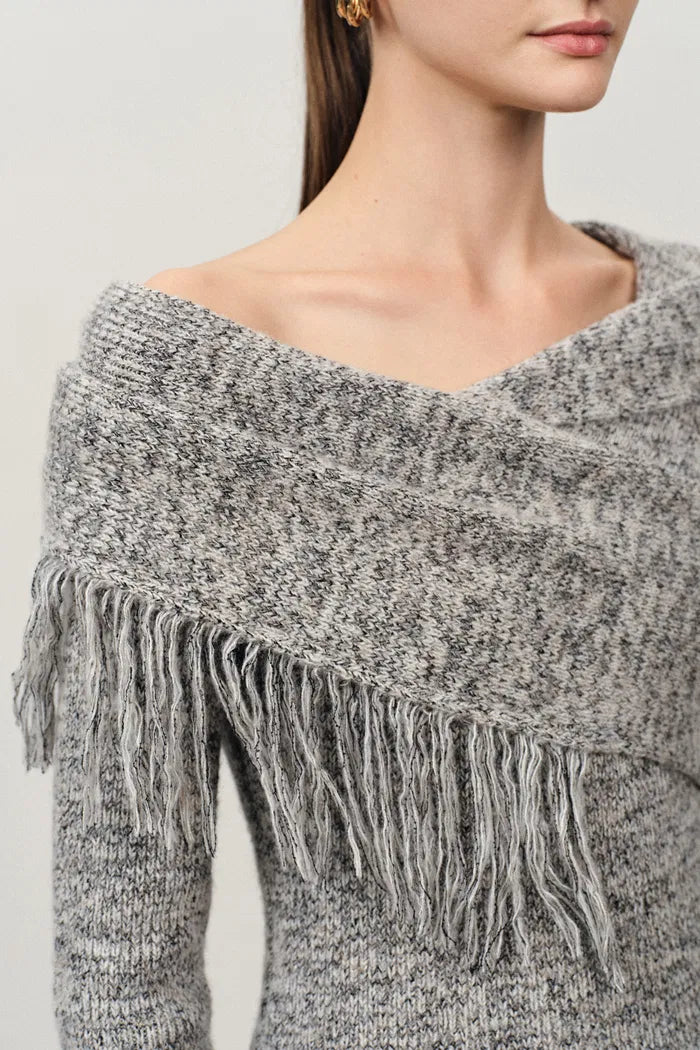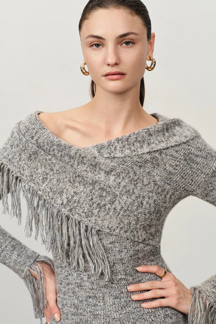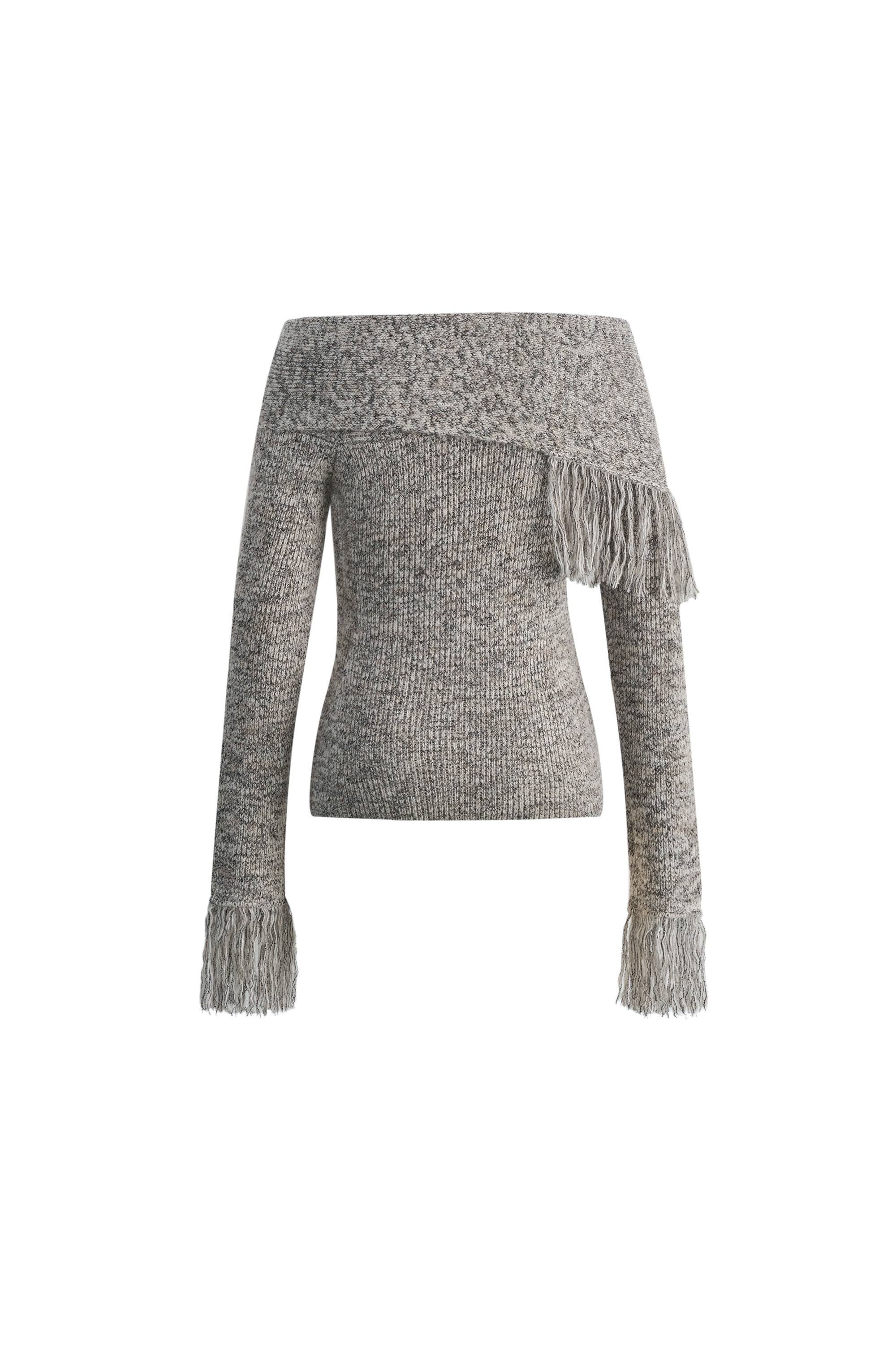 Cross-shoulder construction allows adjustable off-shoulder styling while tassel details add movement. Five yarn blend creates cloud-soft texture while the light grey mixed coloring provides sophisticated neutral appeal.
