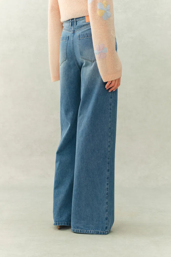 Handcrafted 3D flowers bloom across these straight-leg jeans, making them a standout piece for the season. The soft, breathable cotton denim and classic wash provide a comfortable base for such an artistic detail.