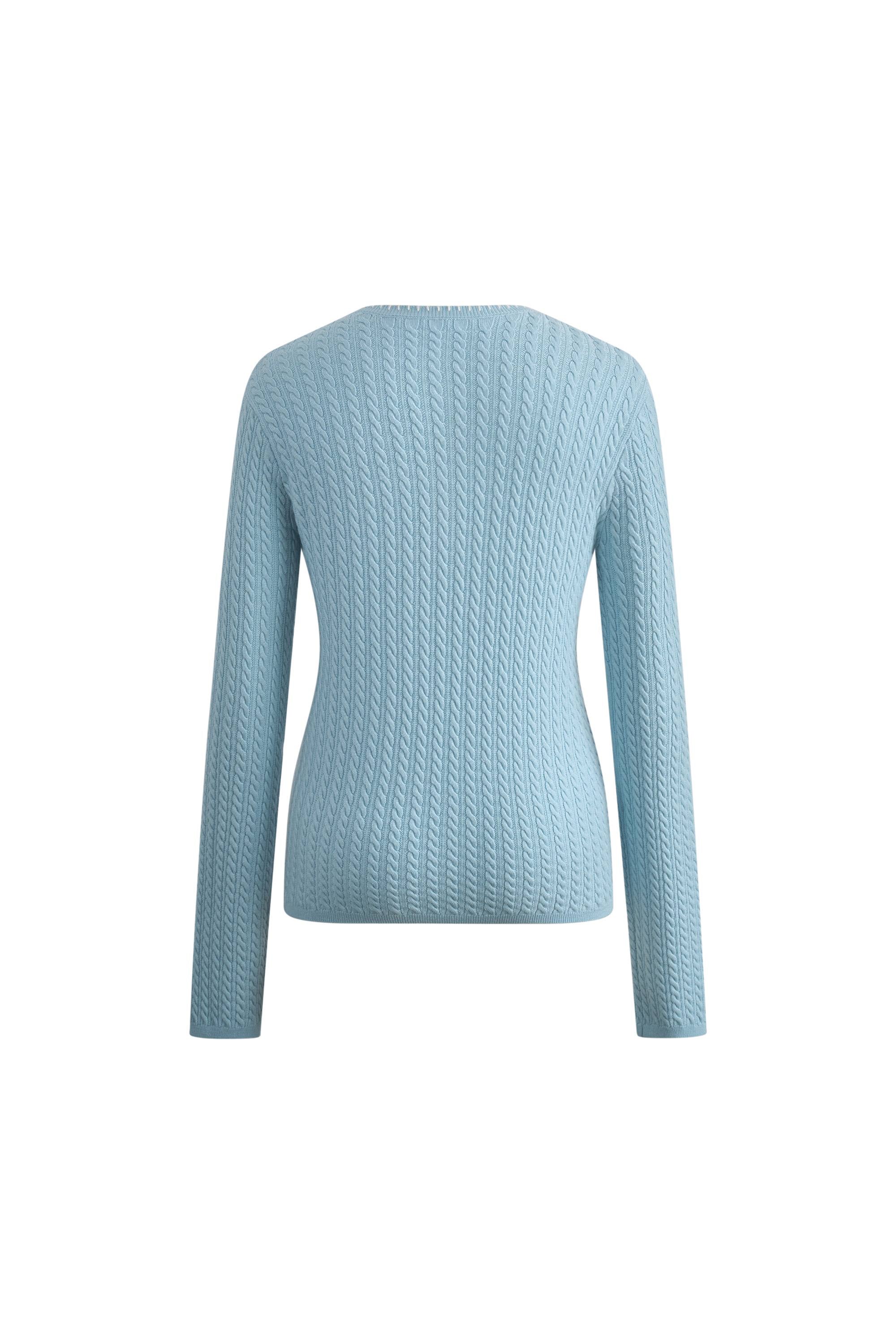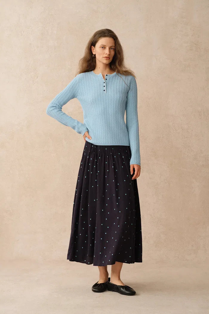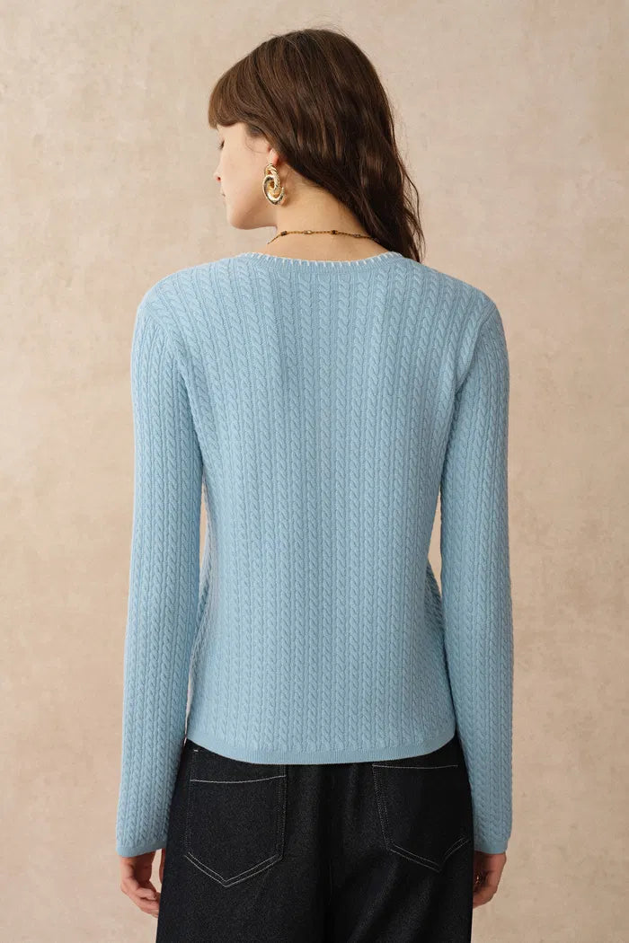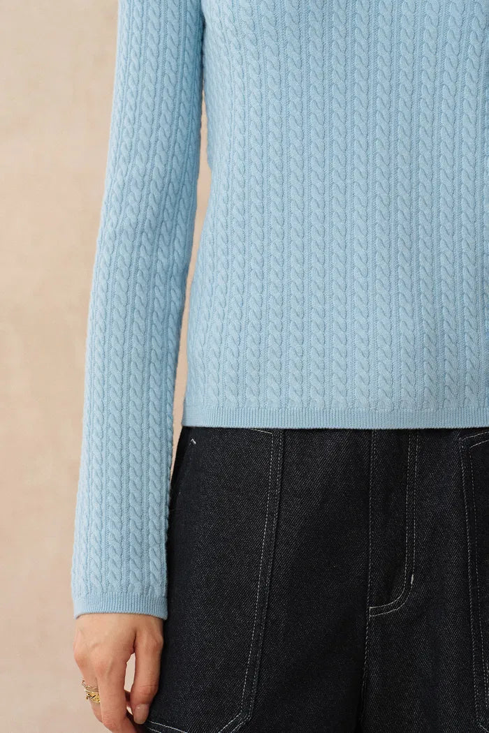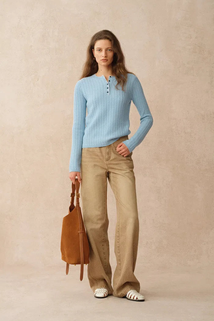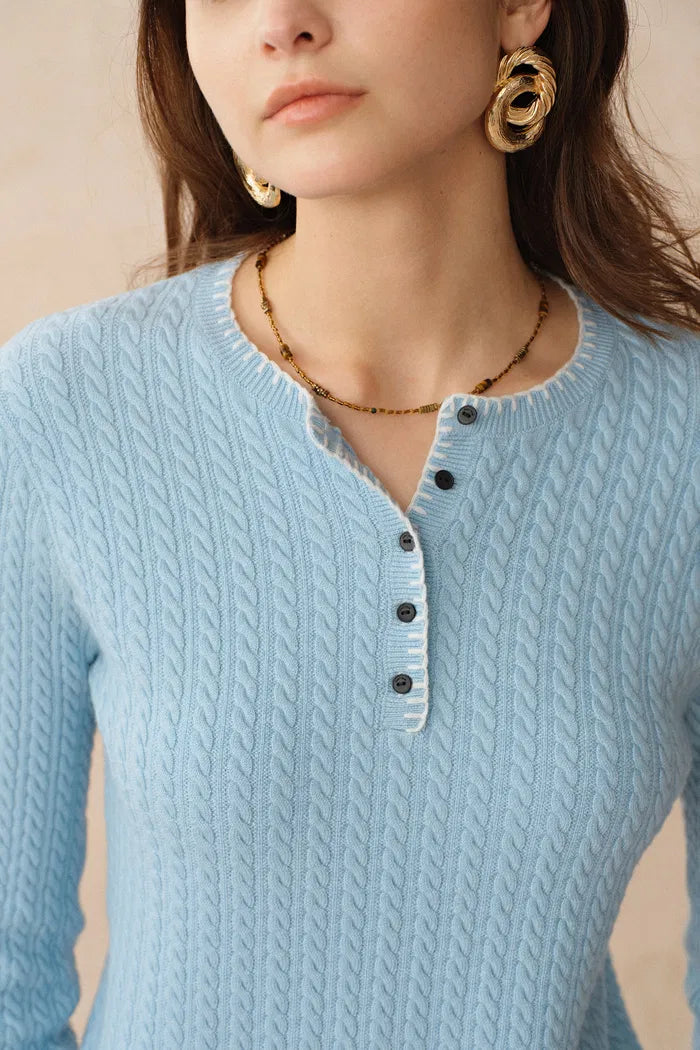 Mika Blue Henley Neck Long Sleeve Top in Merino Wool Cable Knit