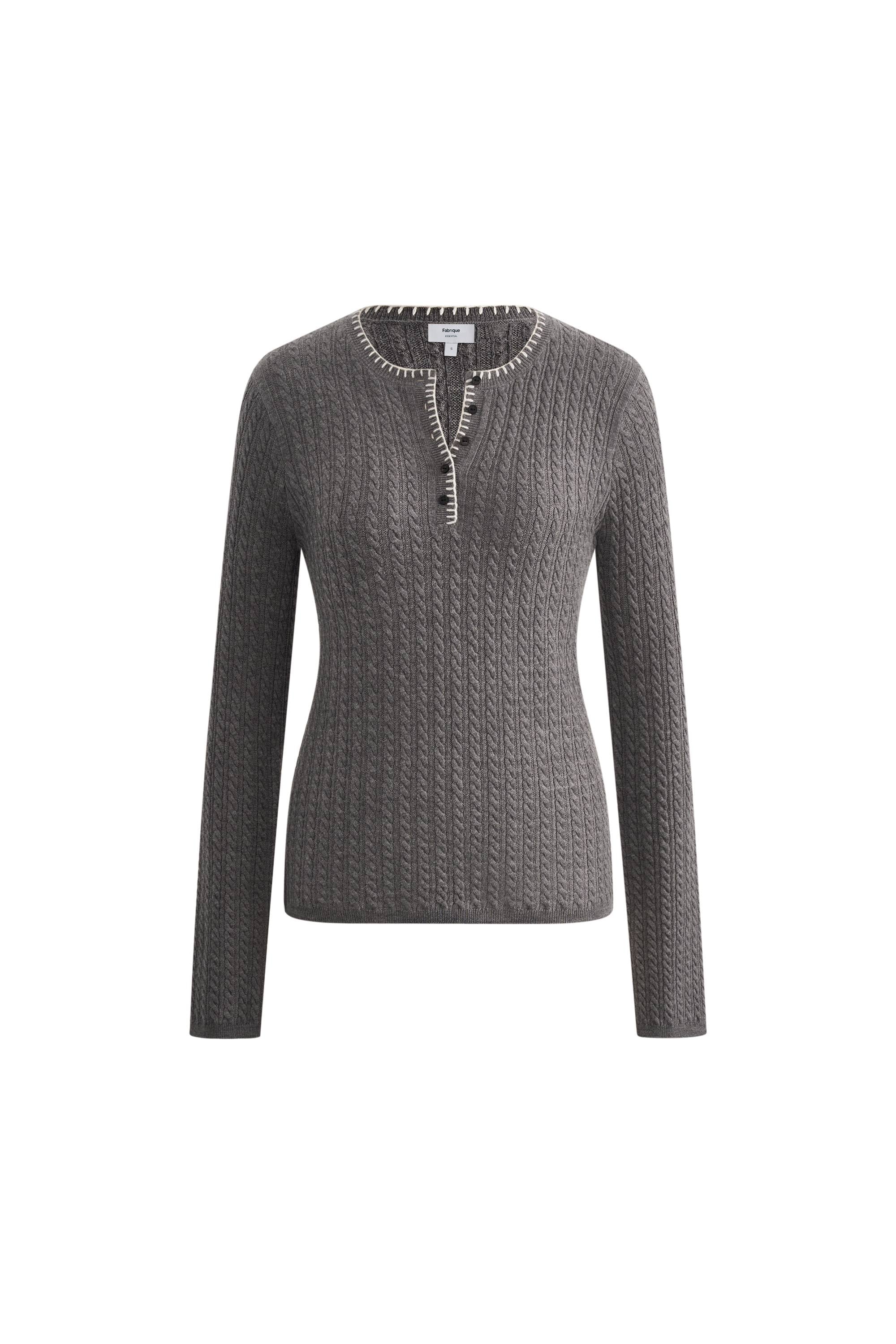 Zigzag edge stitching elevates this Henley beyond basic knitwear. Cable texture adds visual interest while adjustable buttons let you control coverage. Fine merino yarn creates stretch without losing shape.