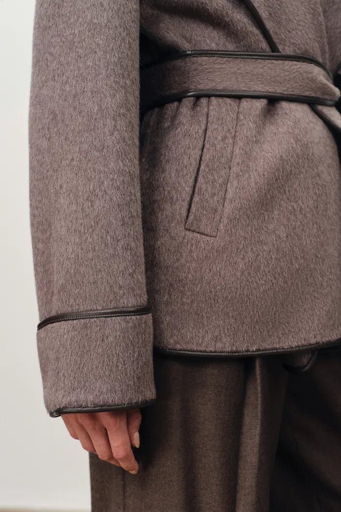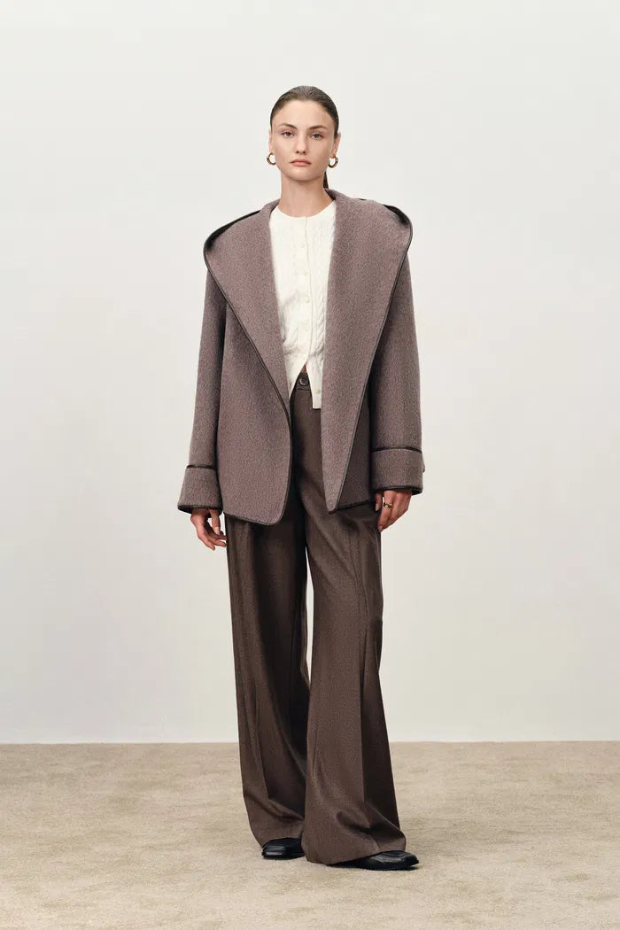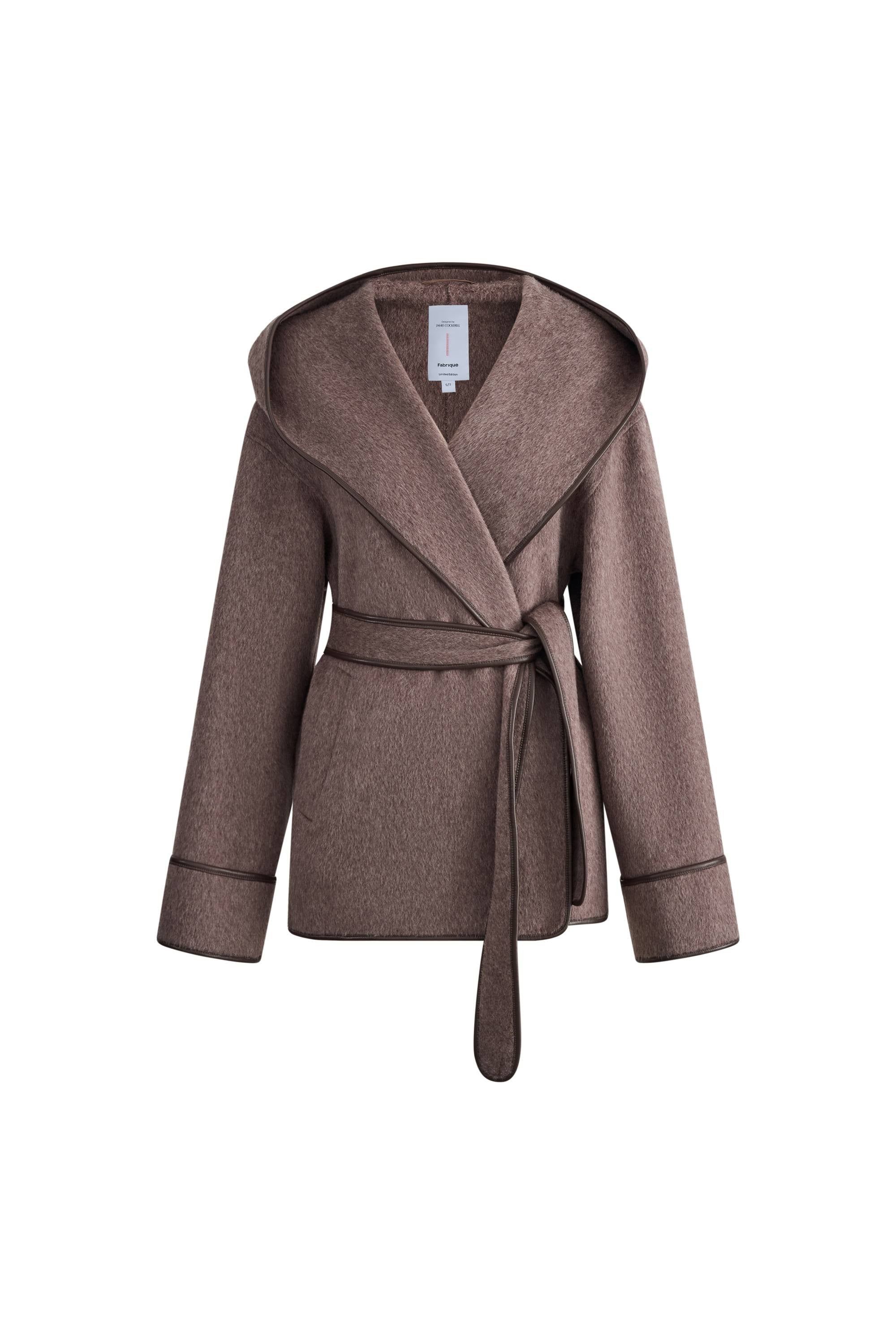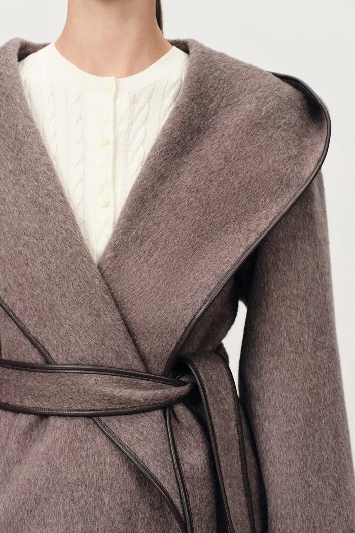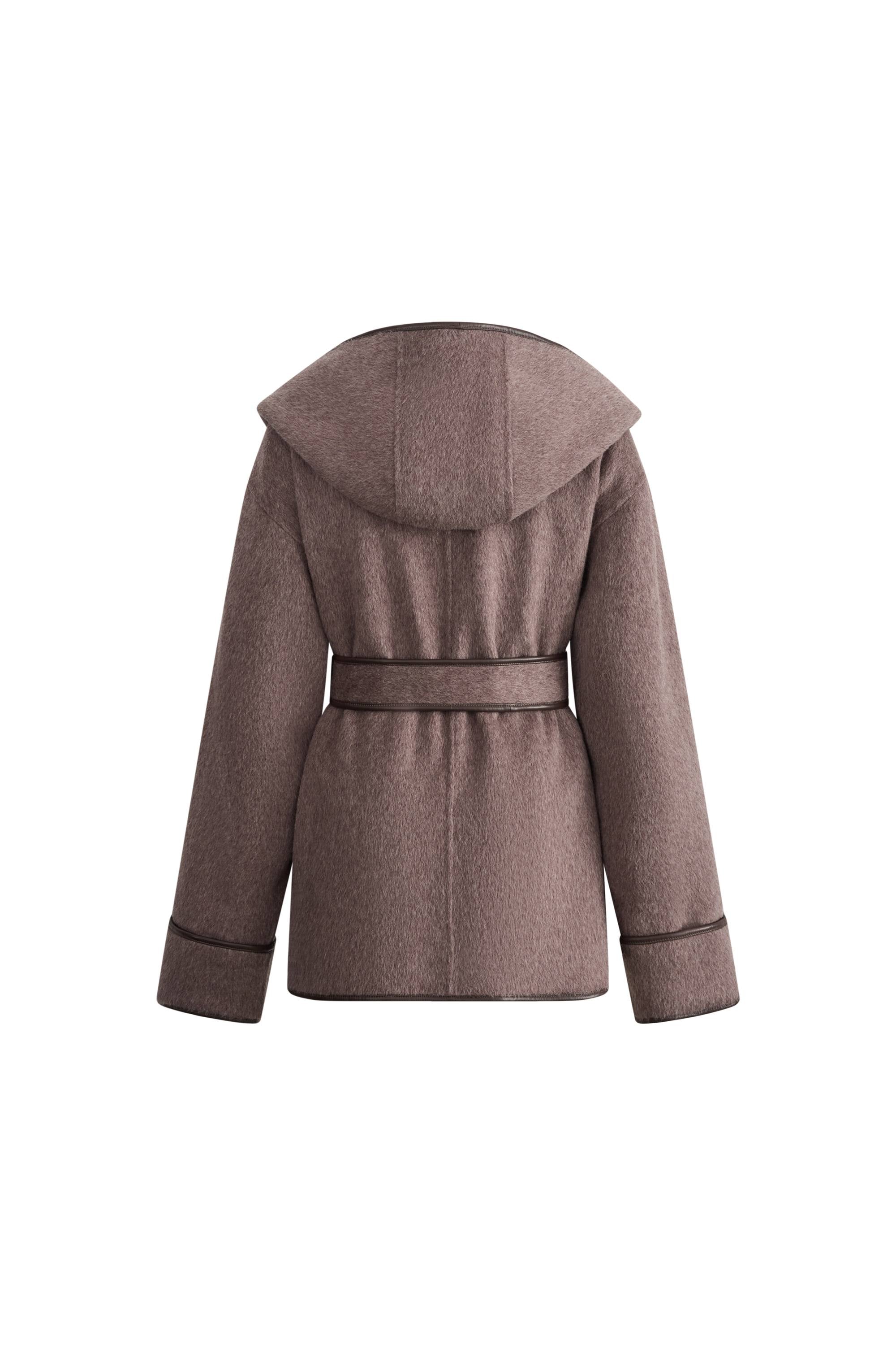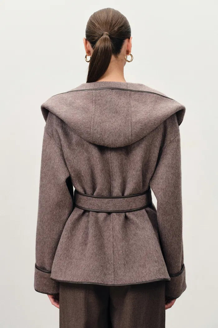 Mila Belted Leather Trimmed Oversized Hooded Pea Coat in Double Face Merino Camel