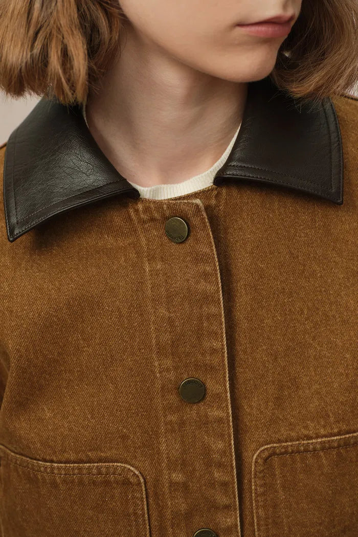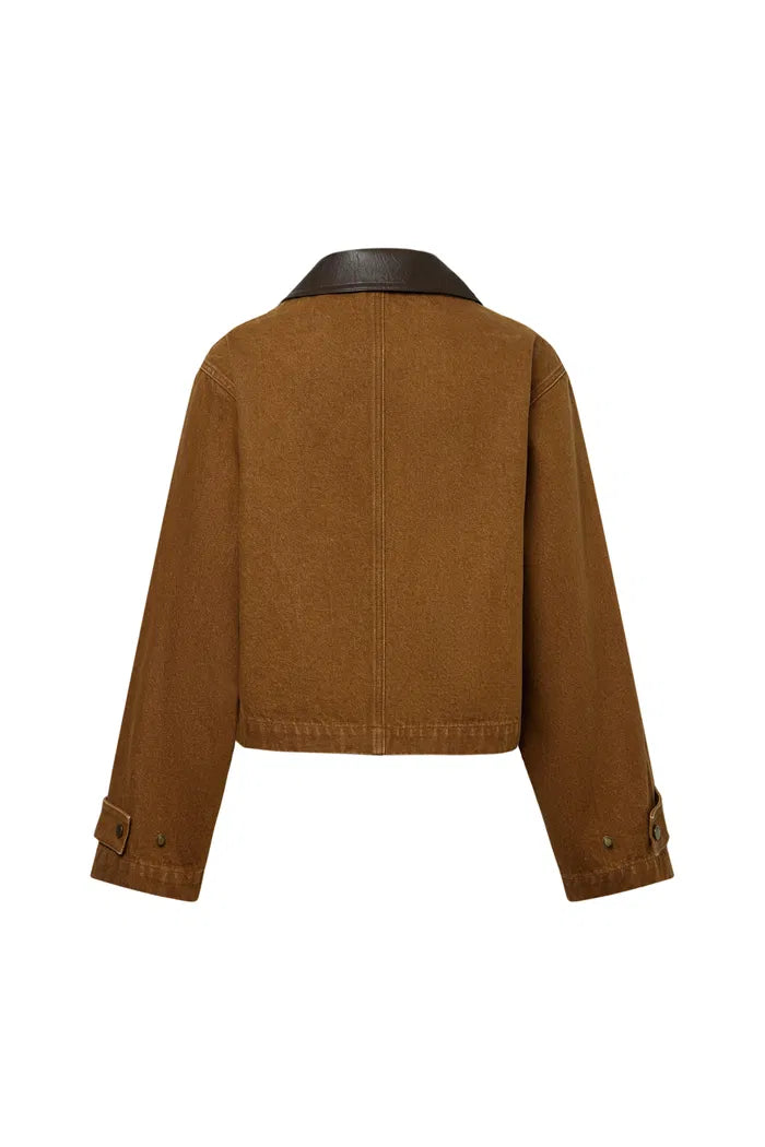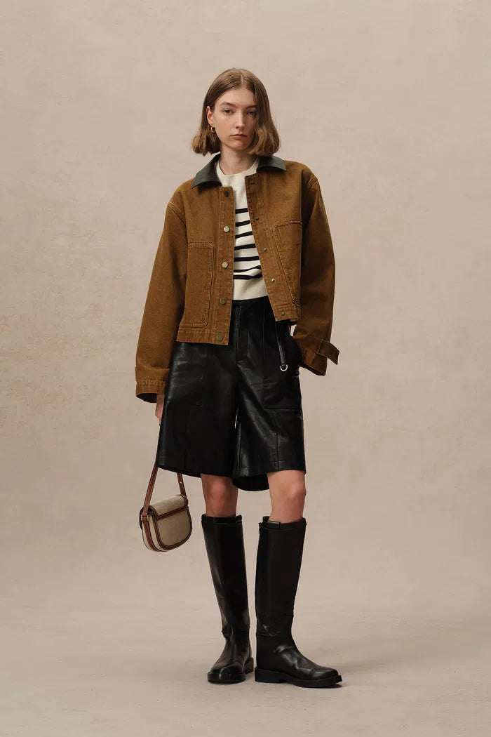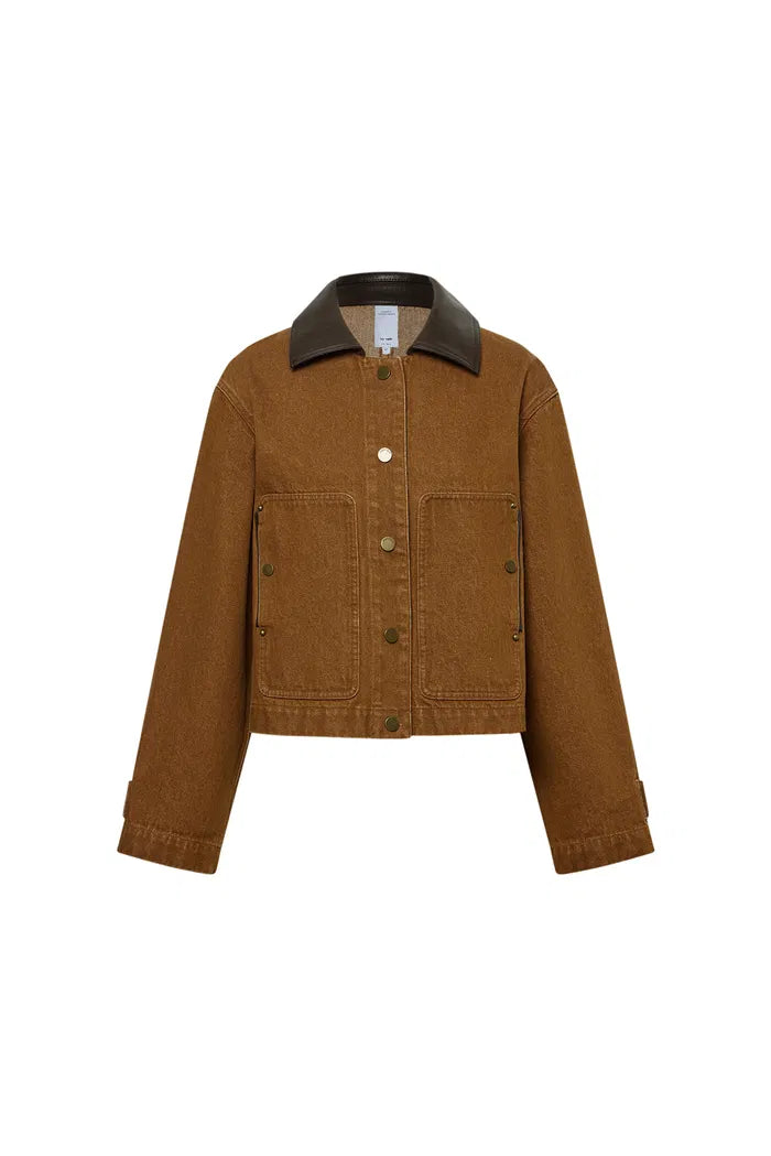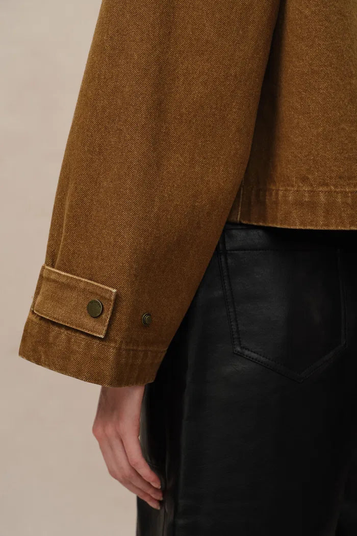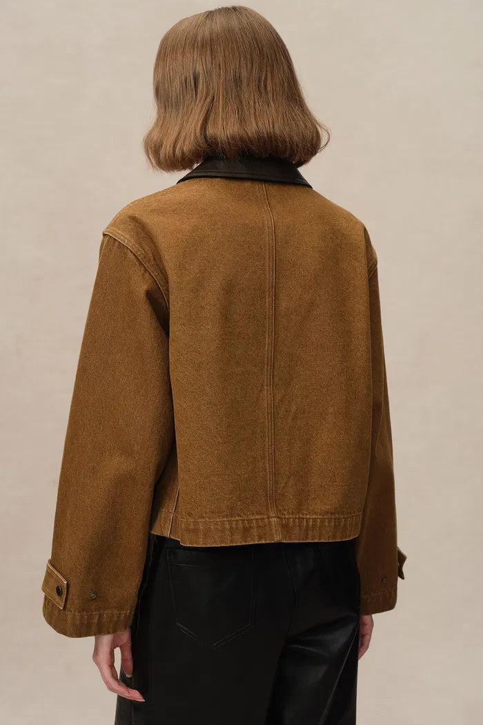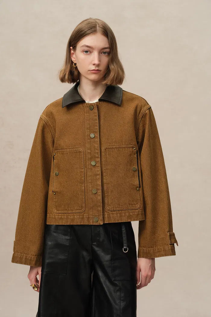 This cropped jacket channels the rugged essence of classic workwear with a distinctly modern flair. The combination of cruelty-free faux leather details and bronze snaps enhances the utilitarian vibe of the washed cotton canvas, while adjustable cuffs add a practical touch that nods to traditional barn-style jackets.
