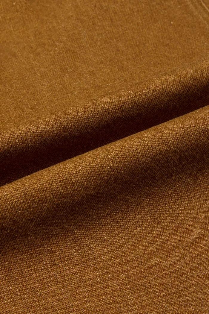 Soft yet structured. Breathable, comfortable. Retains 3D shape after washing. Artisanal spray-dye in chestnut brown for authentic vintage workwear aesthetic.