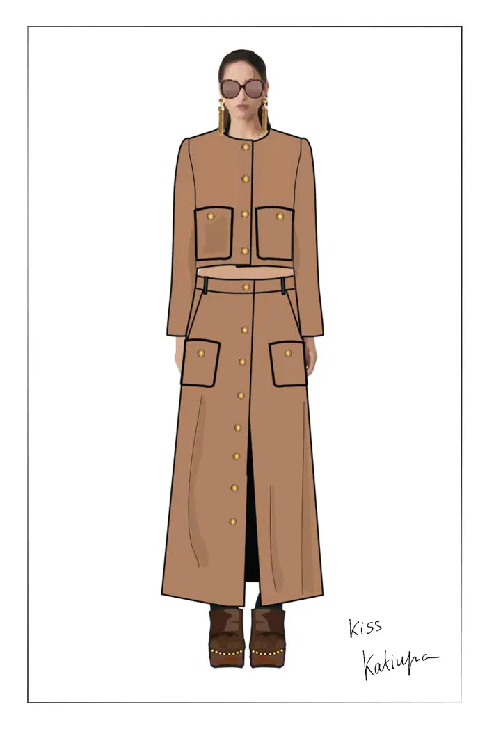 Katiuscia designs for women who love to express their unique personality through details. Black leads the way, softened by hints of vanilla white, warm cappuccino brown, and ice blue. Gold accents highlight the tailoring and add richness. For her, clothing becomes a way to express personal freedom and stand out naturally.