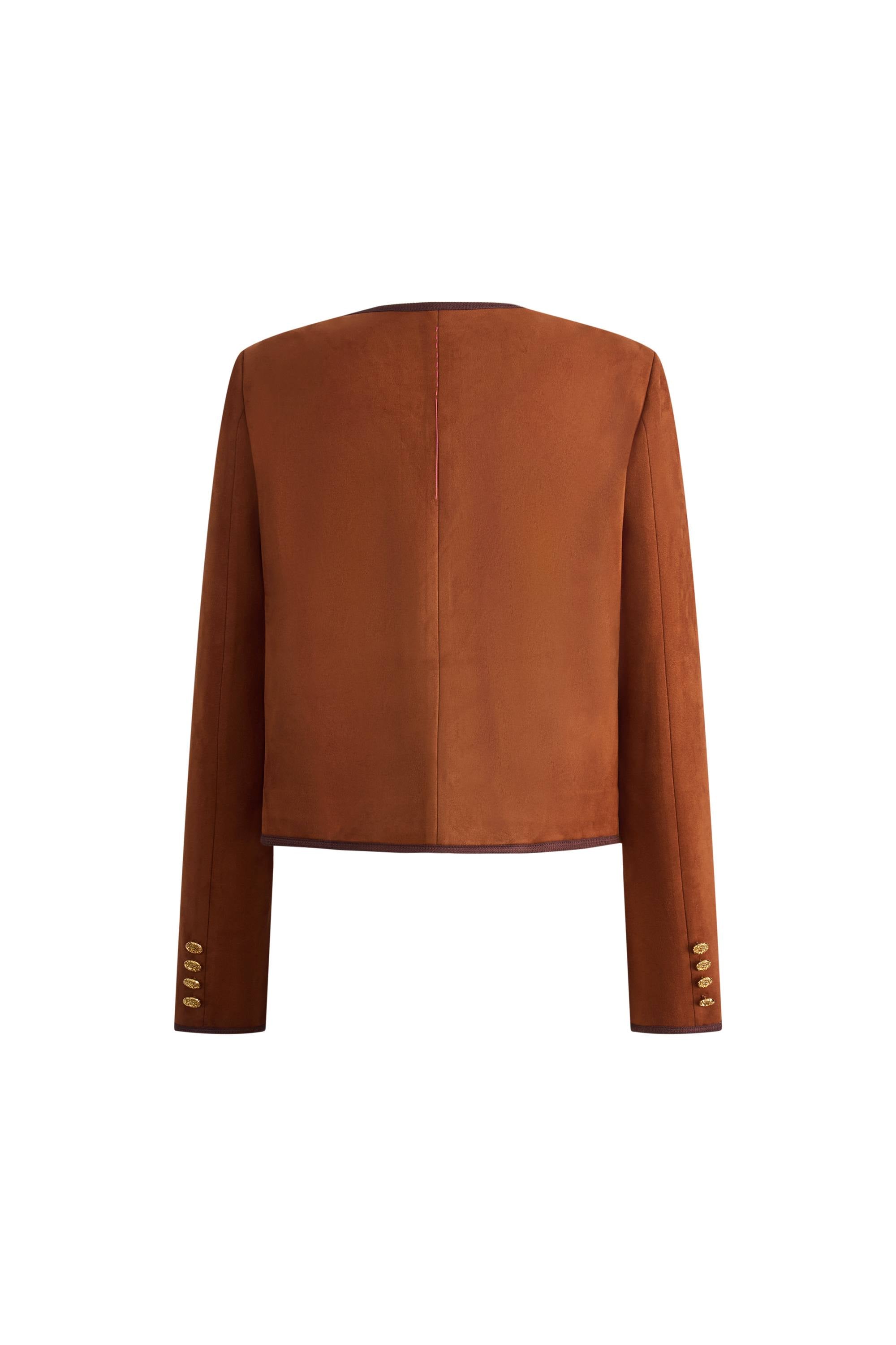Completing the coordinated collection, this boxy jacket features the same cinnamon brown faux suede with contrast webbing trim and gold emblem buttons for sophisticated matching pieces.