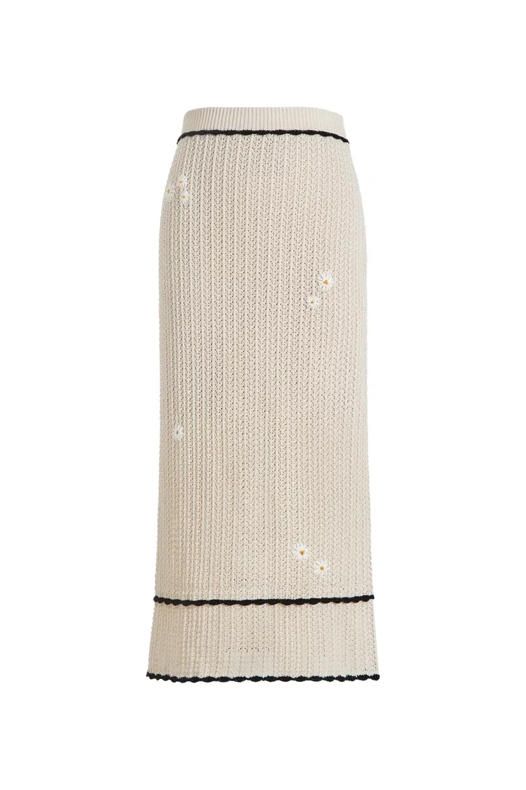 Palma Hand Embroidered Daisy Applique Crochet Skirt in Cotton Linen Blend