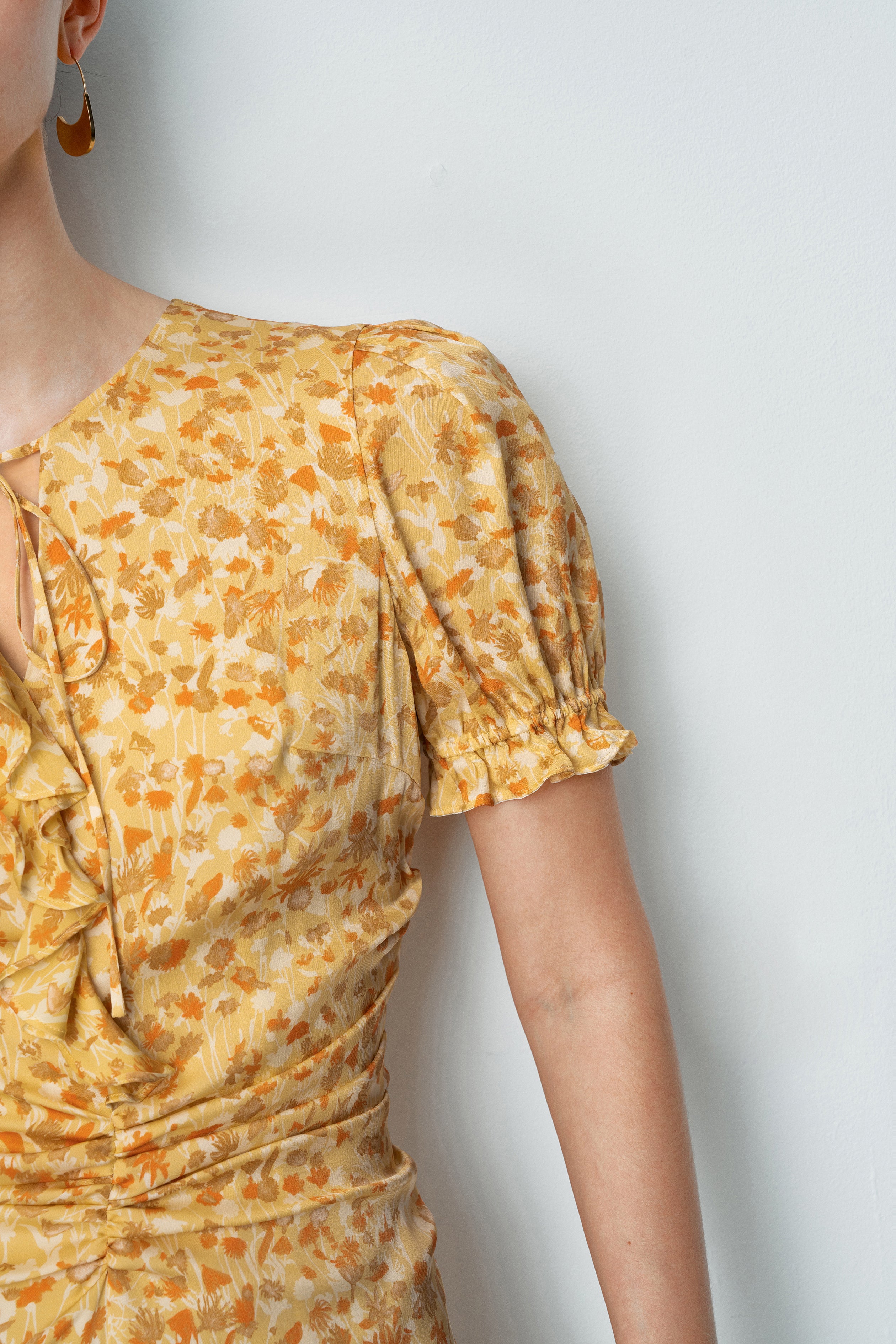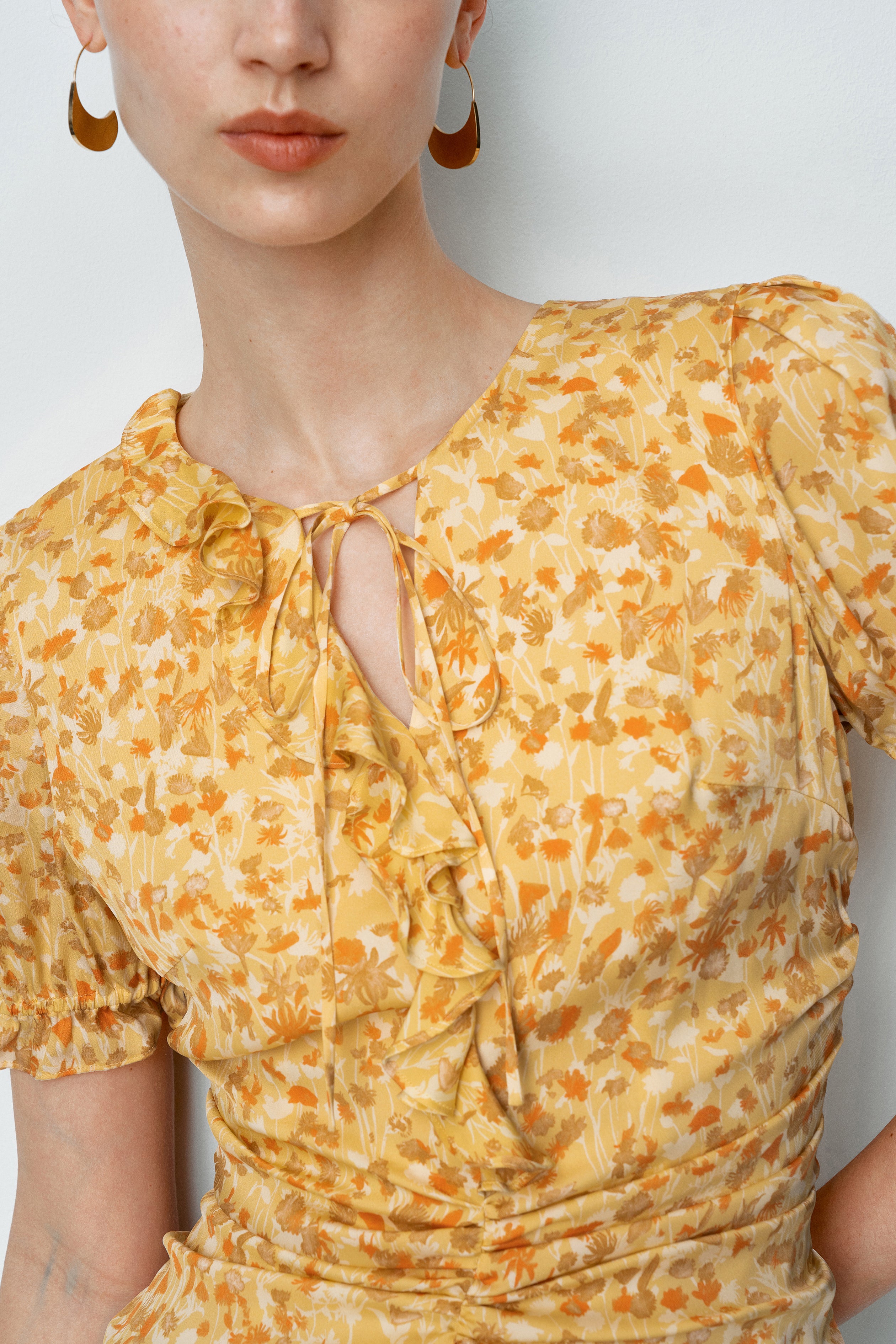 - Ruffled V-neck design