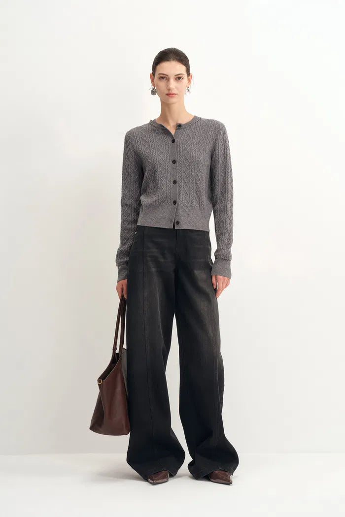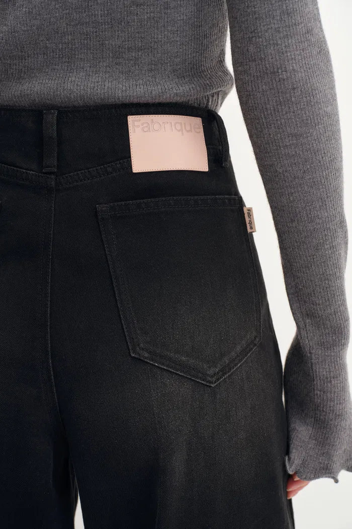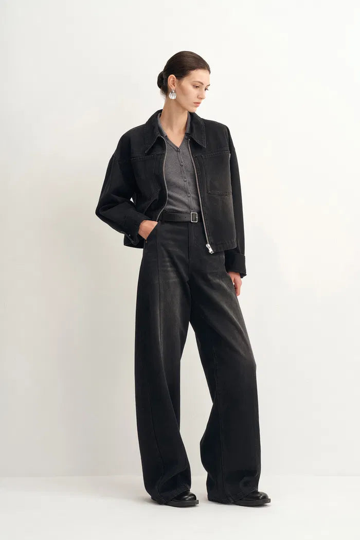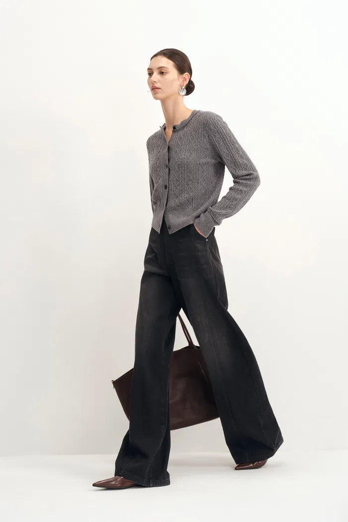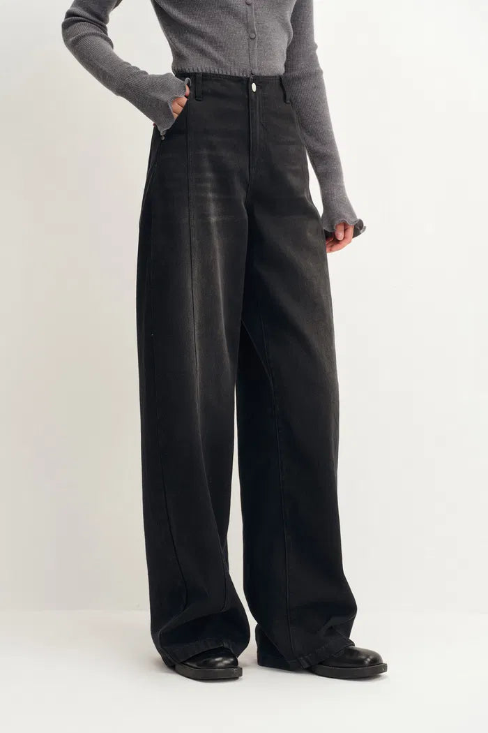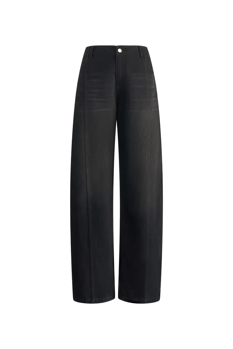 - Curved wide-leg silhouette