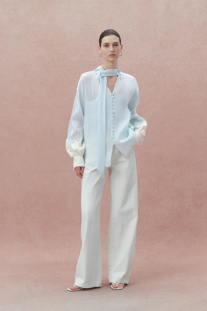 This Paz top pairs V-neckline ties with balloon sleeves for romantic proportion. White floral lace trim contrasts beautifully against ice-blue silk-linen, while fabric-covered buttons add custom detail. The curved hem creates graceful movement—perfect for pairing with matching shorts. Suggest to pair with its matching shorts.