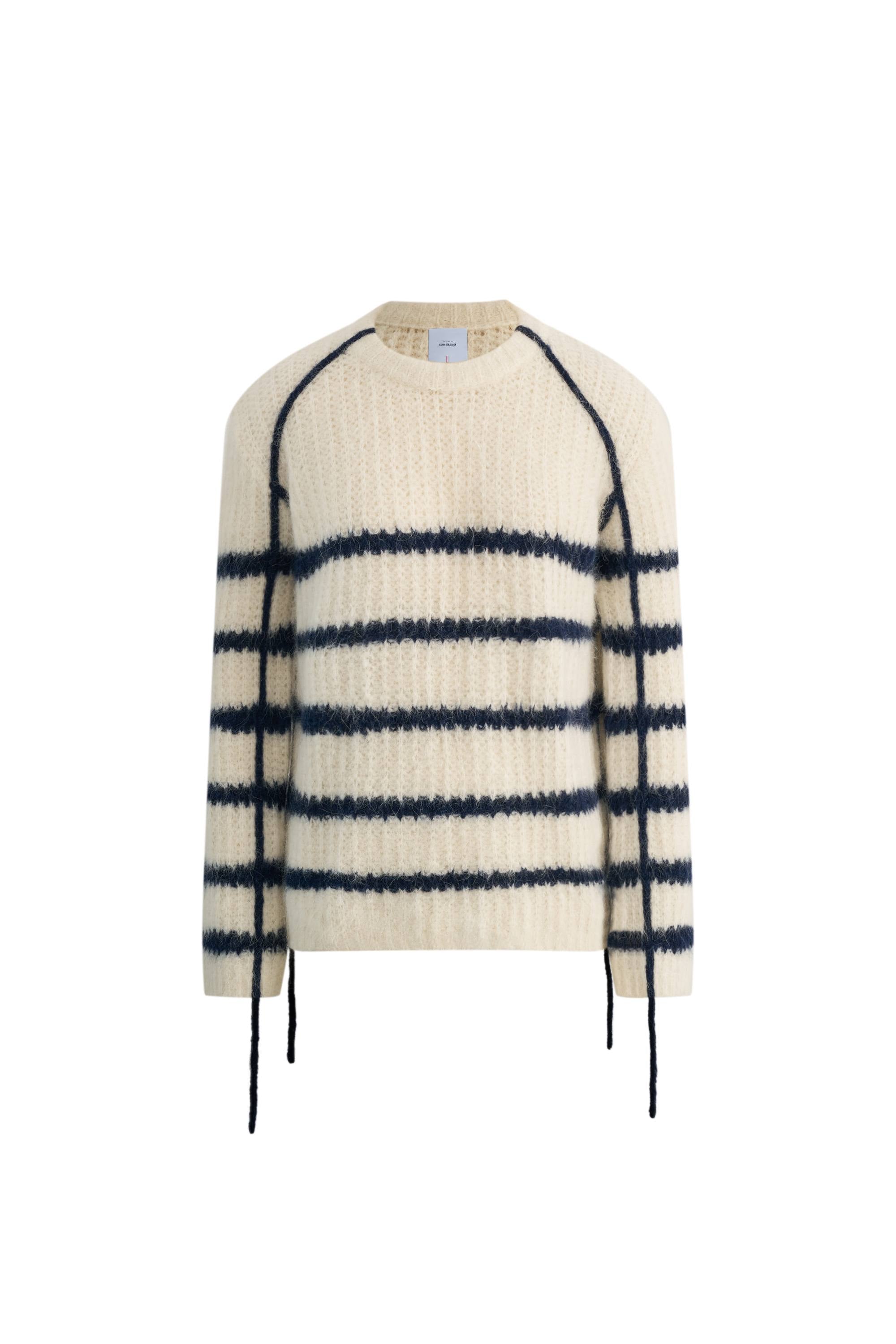 Irregular stripes mimic ocean waves through deconstructed shoulder construction while contrast webbing adds nautical authenticity. Cloud-soft alpaca provides warmth while the asymmetric pattern makes each piece feel uniquely made.