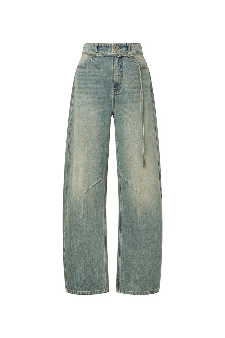 Skylar Denim Tie Belted Barrel Leg Jeans in Washed Cotton Denim