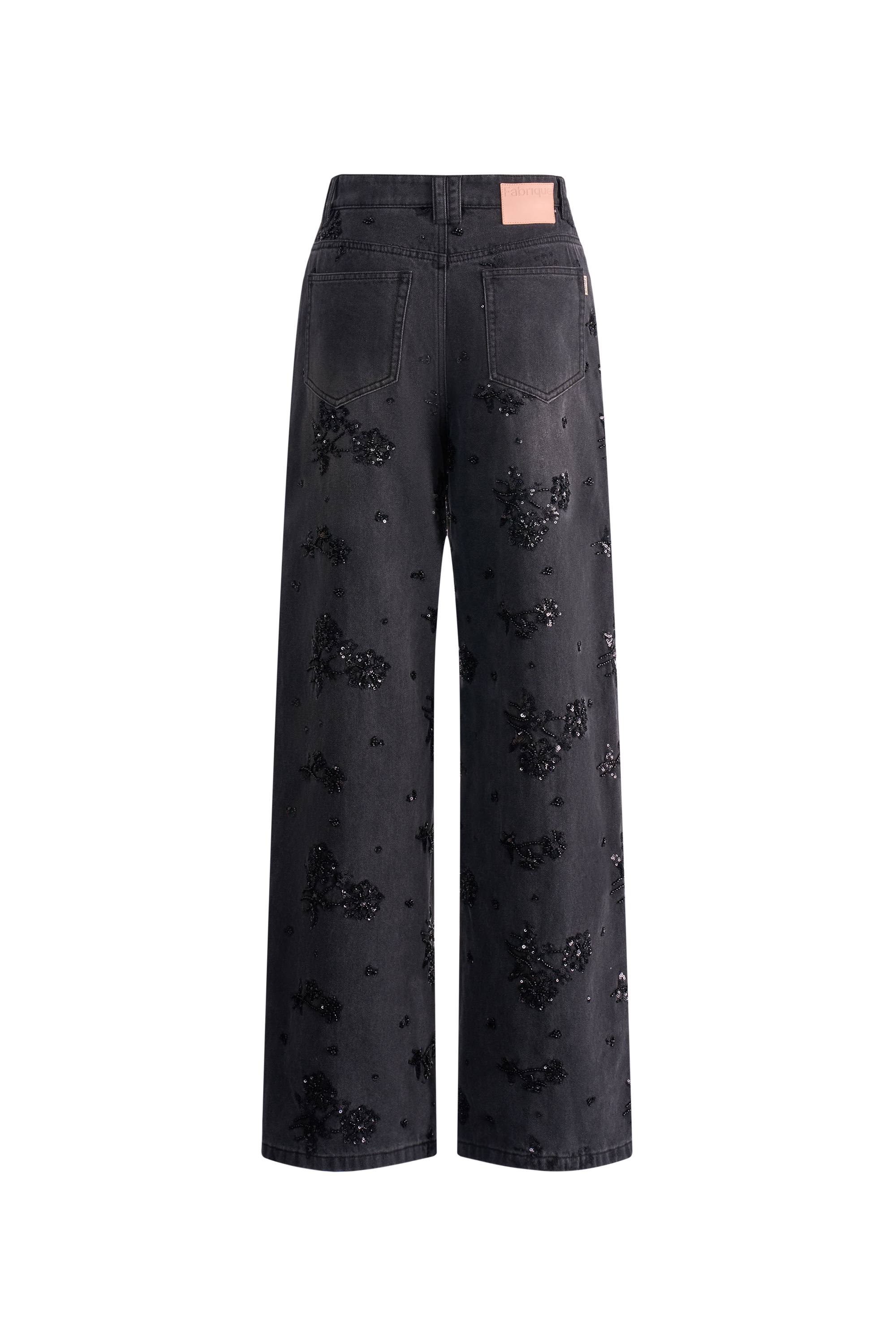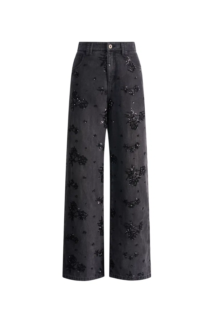 Star Hand Beaded Rose Embellishment Straight Leg Jeans in Beaded Cotton Denim