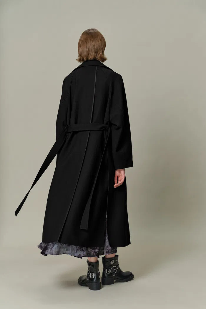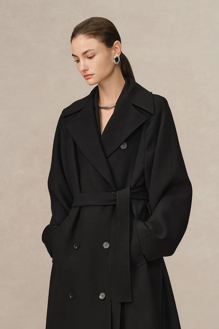 Inspired by vintage British fashion, this wool twill trench coat combines a striking large lapel with custom horn buttons, offering a fresh spin on classic style.