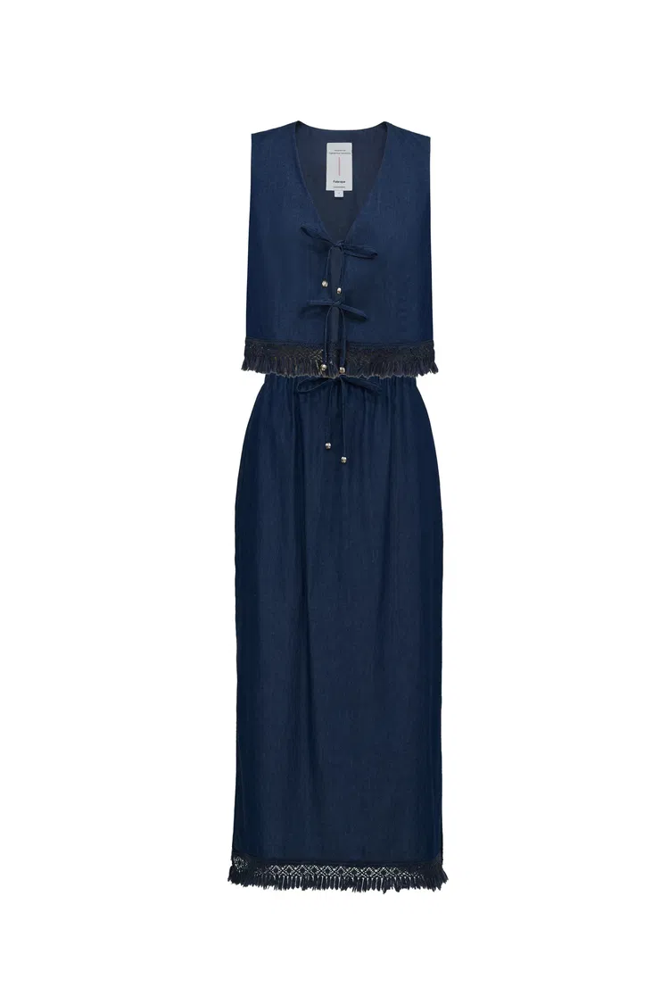 Velia Handcrafted Tassel Vest and Skirt Set in Cotton Denim