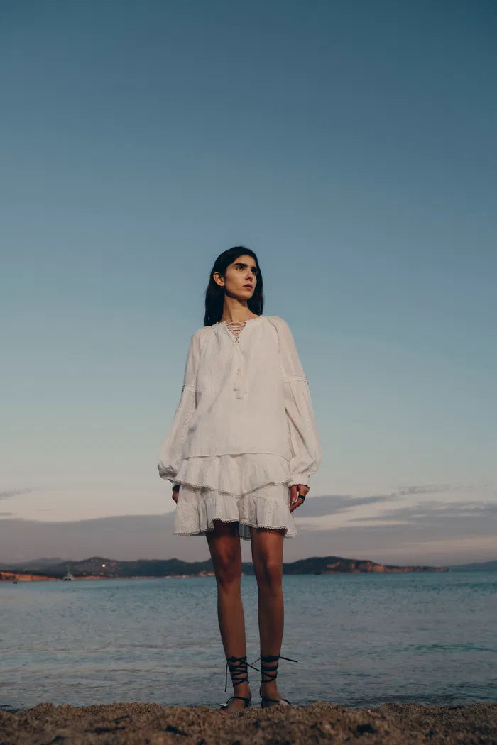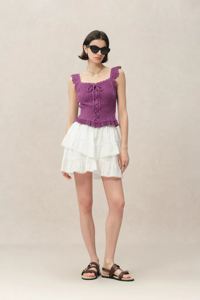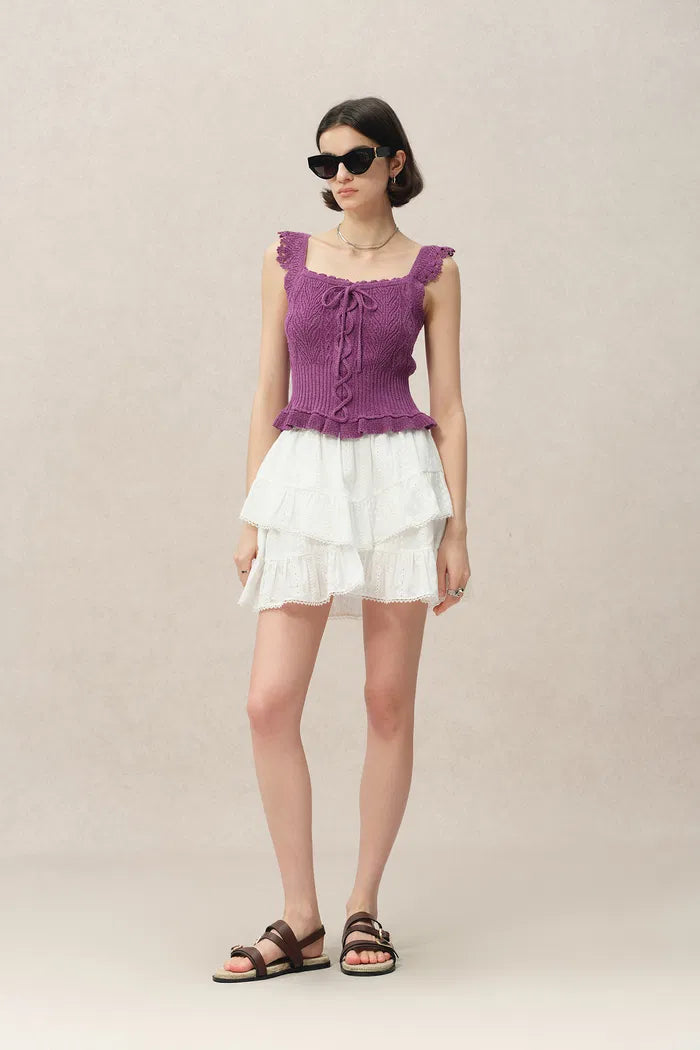 This mini skirt turns summer nostalgia into modern fun. Delicate cotton embroidery captures vintage lace patterns, while the double-layered, cake-like shape brings playful volume. The comfortable elastic waist and built-in shorts make it as practical as it is pretty. Suggest to pair with its matching Top.