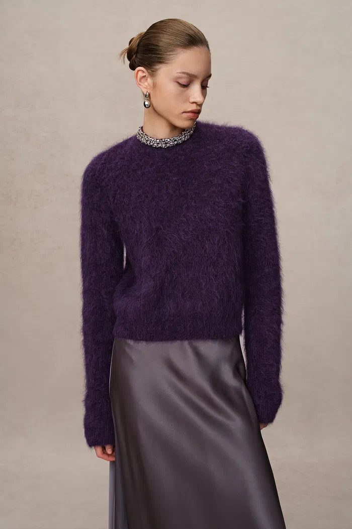 Fluffy blend of alpaca and kid mohair. Mohair adds subtle sheen, alpaca provides lightweight warmth. Custom deep purple reminiscent of wisteria blooms for romantic elegance.