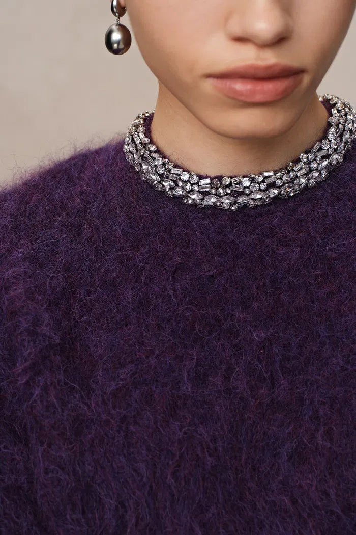 Violet Hand Sewn Crystal Stand Collar Sweater in Alpaca-Mohair Knit